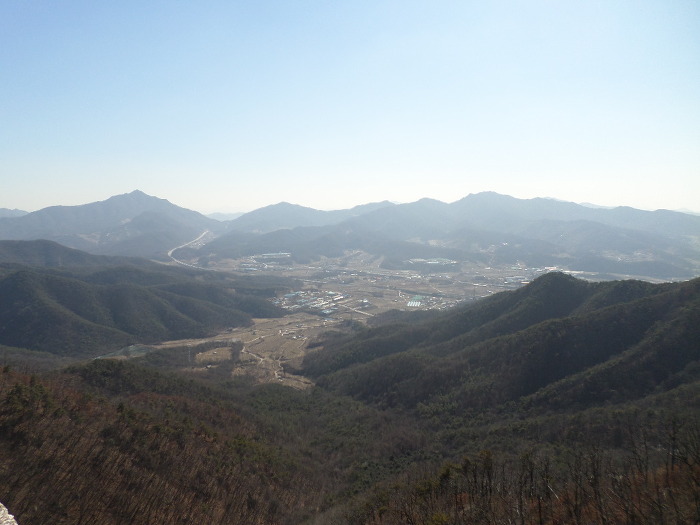 조망바위에 올라 문촌리 넘어를 바라보니 뾰쪽하게 생깄는기 국망산~승대산~원통산 줄기로 가늠되는데