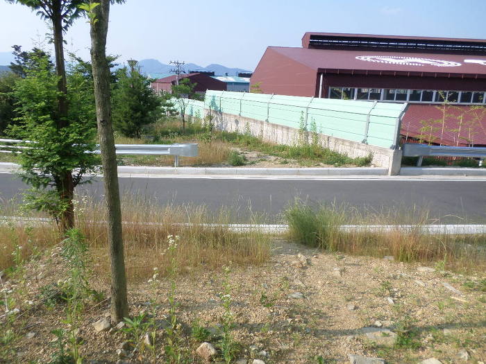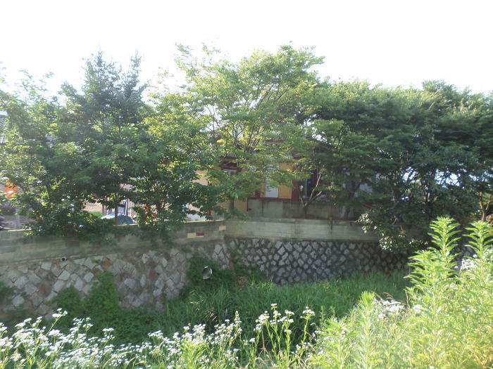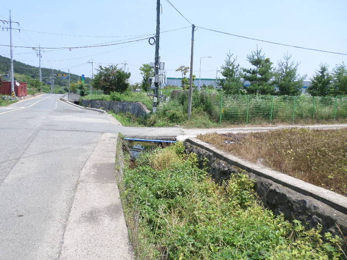 왼쪽으로는 농가로 이어지는 다리가 보이고 개울과 공단 철망 담장 사이로 흐릿한 족적이 보이는데
