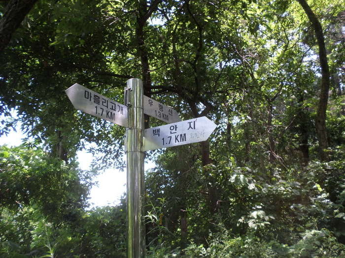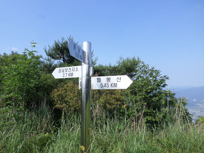 송전탑 부근이라 카는 위치 표시 이정표가 서있는 안부쪽으로 내리와가 직진 상남보건지소 방향으로