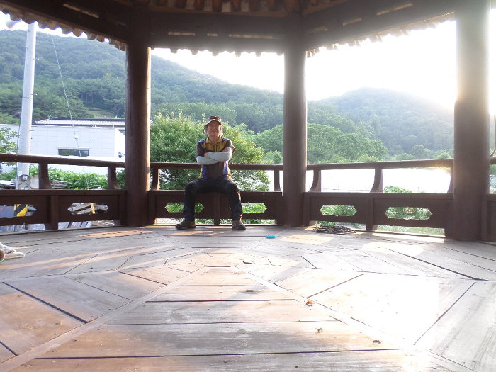 더분날에 신작로를 한시간 이상 걸어온 피로가 싹 달아나미 기분이 업되가 카메라를 마주 보이는 정자 난간에