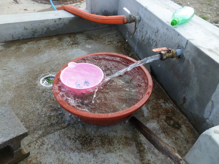 아까 산에 올라가기 전에 정자옆 농가에서 물이 콸콸 나오길레 지하수를 끌어 올리는갑따 케띠마는 하나 둘