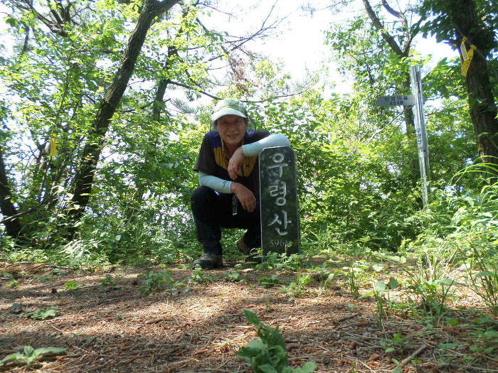 잠시후 이정표와 돌아앉은 정상석이 보이는 평편한 우령산 짱배기에 올라선다!~