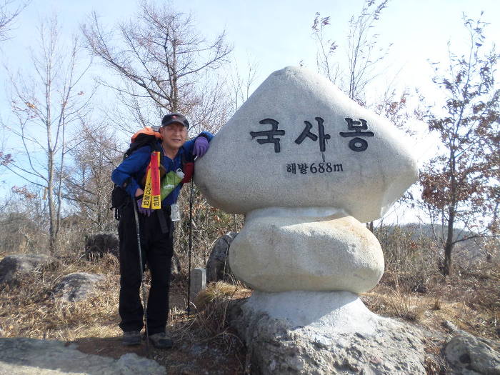 산행 시작한지 1시간 쪼매지나가 국사봉 짱배기에 올라선다!~ 예전에 안보이던 대빵큰 정상석에 기대가 찰칵!~