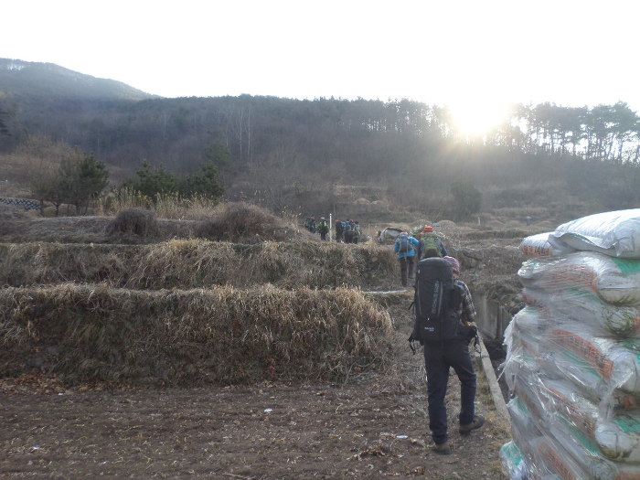 오른쪽으로 계단씩 밭이 보이는 곳으로 내려서며 지나온 길을 돌아다 본다!~저쪼 능선을 타고 말발굽형으로