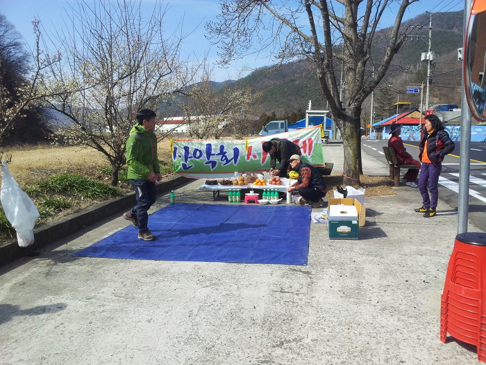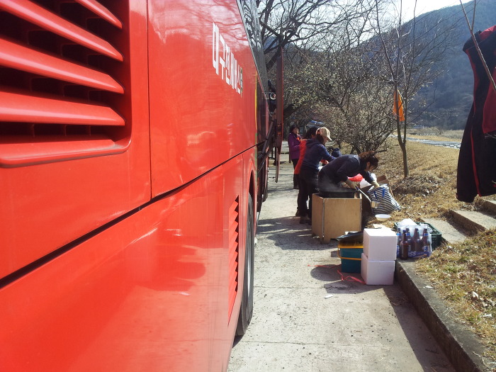 달구지 안쪽에는 여총무하고 도우미들이 배고픈 어린양을 믹일라꼬 떡꾹을 끼리고 있따!~