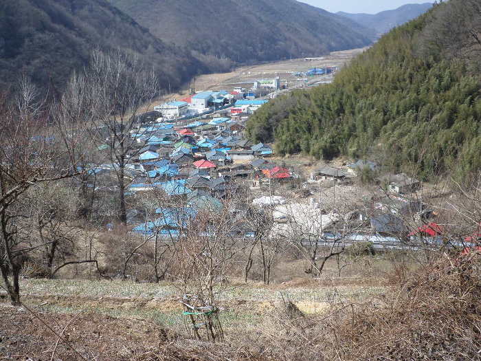 마을쪽을 내리다보이 죽전마을이 억사구로 크다!~가운데 무신 파란 창고 건물 같은 곳에는 아침에 타고온 뺄간