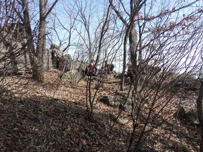 국사봉 정상에 올라가이 좁은 바위 사이를 문테고 통과한 정사장이 헥헥거리고 있따!~ 땅바닥에 무치있는