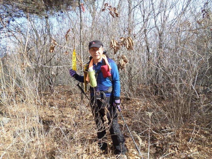 헤치미 올라가가 미리 맹글어온 현위치를 알리는 표지기를 달아 논는다!~ 잠시후 노송은 지파산을 찍고