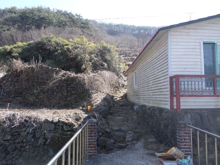 질퍽거리가 흙이 떡떡 딸라붙는 밭뚝길을 내리와가 돌아본다!~탁탁 타닥탁거리미 신발을 털고 내리오이~