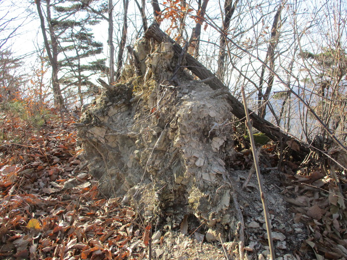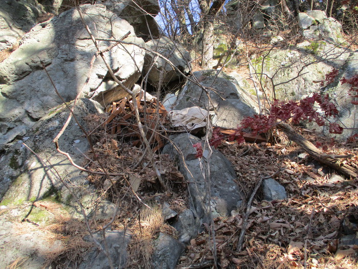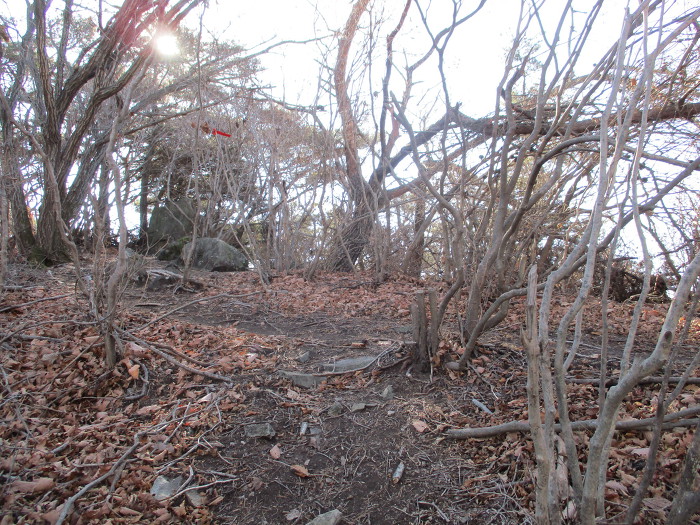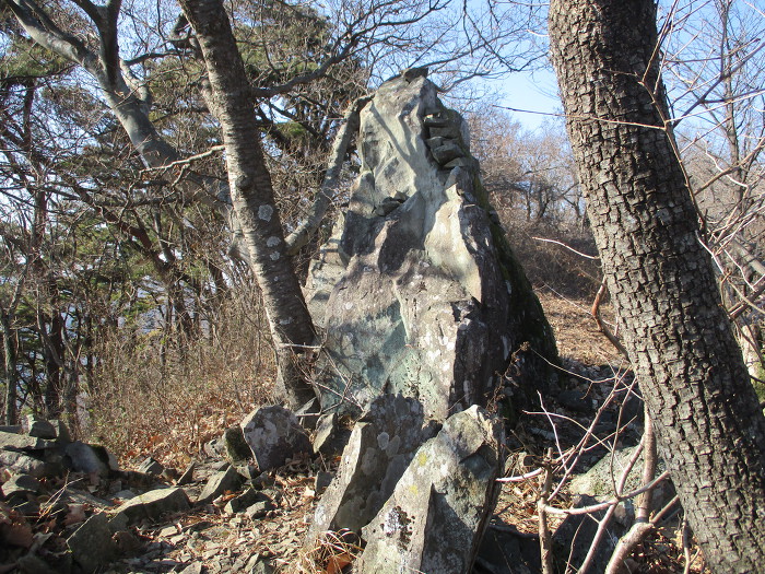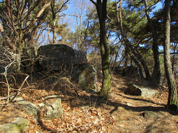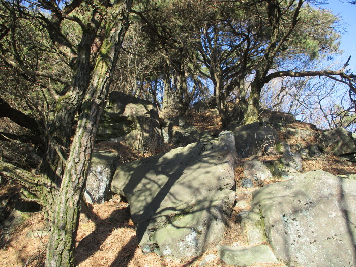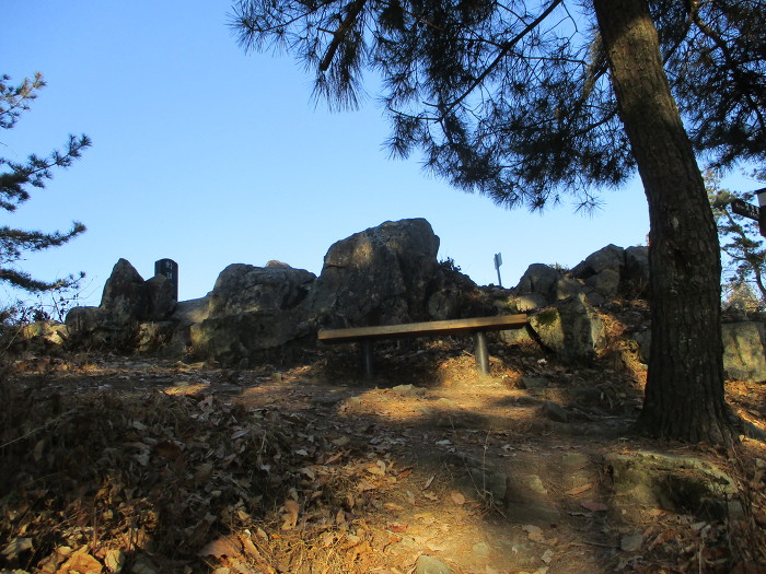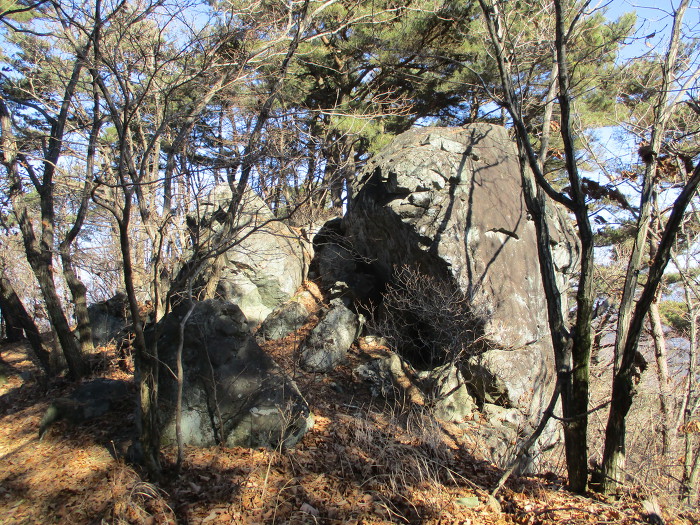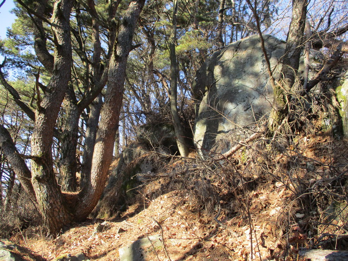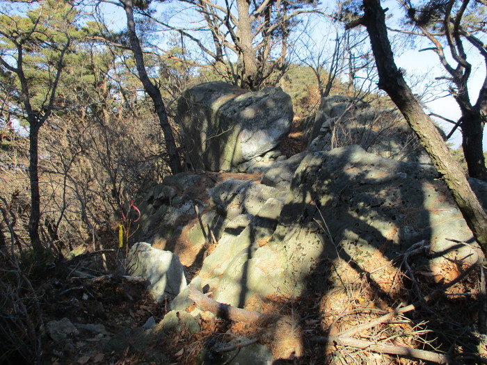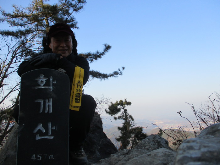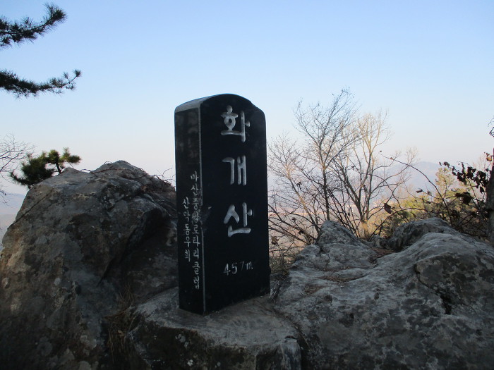 바우 사이에 화개산 정상석이 숨어있는 것이 보인다!~ 안직도 오후 4시 20분 전이라 서두르면 해떨어지기 전에