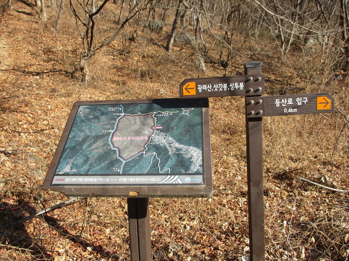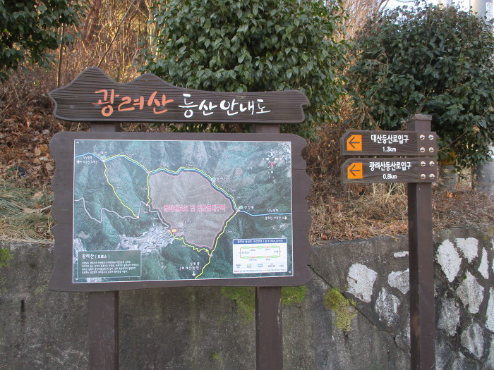 주차장 앞에있는 광려산 등산안내도를 보고있시 동네 주민으로 보이는 젊은 사람 둘이 오디 어디가노 묻길레