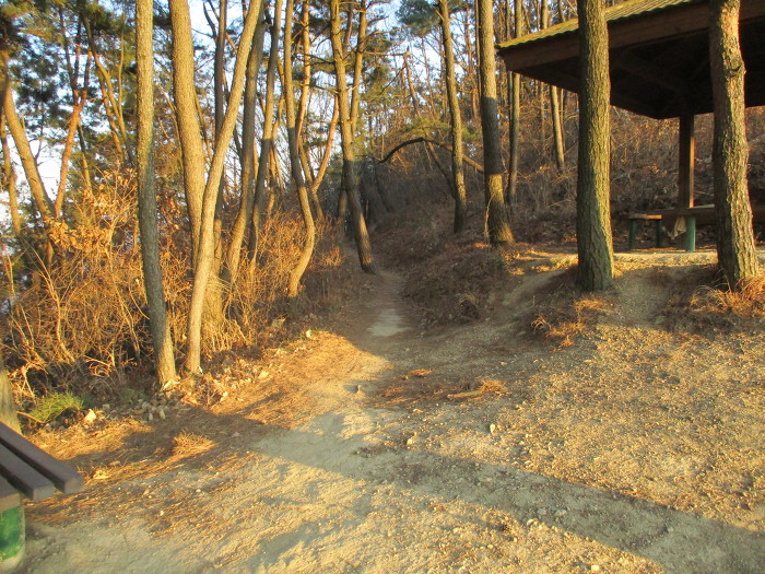 첫번째 왼쪽 갈림길을 지나 이어 만나는 쉼터 정자에는 초소 근무자가 이야기하는 이정목이 서가 있는데