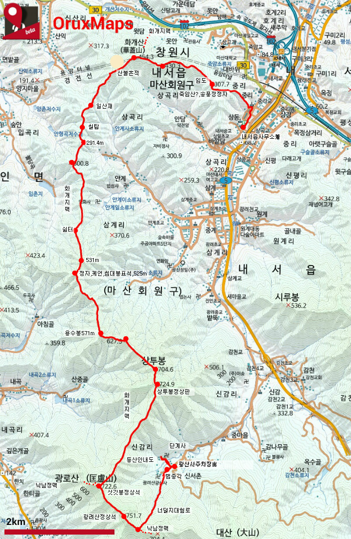 (722.6m,지형도상 광려산)~상투봉(724.7m,정상판)~지형도상 상투봉(703.1m)~623.5m~571m(용수봉)~