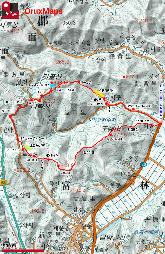 배곡재(도로 공사중)~216.2봉~임도~운동기구 쉼터~아스팔트 포장도 접속~오른쪽 올라~
