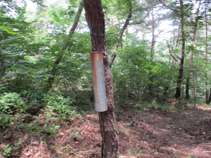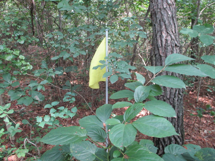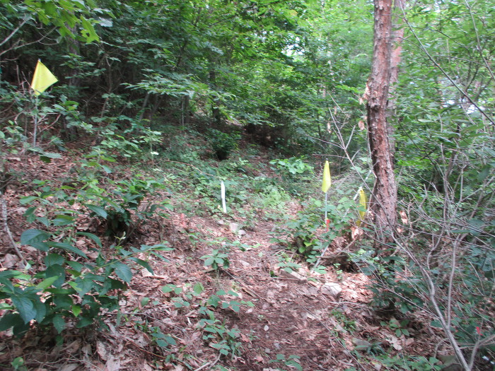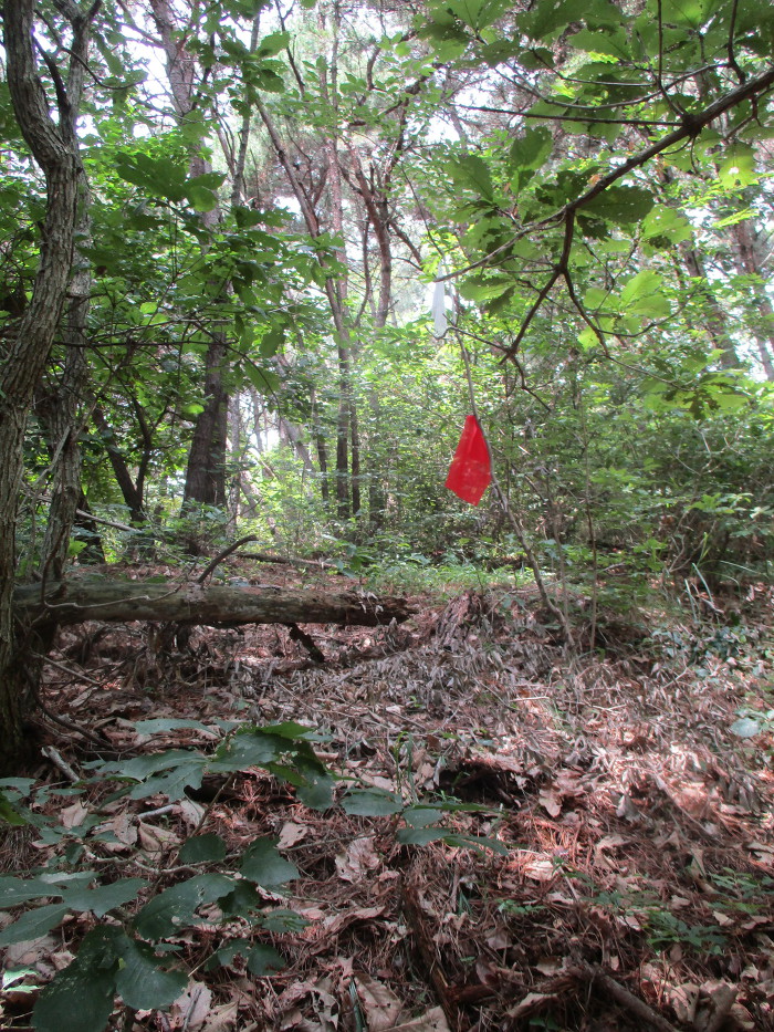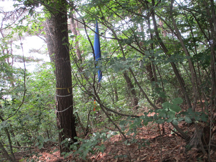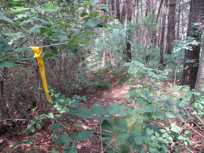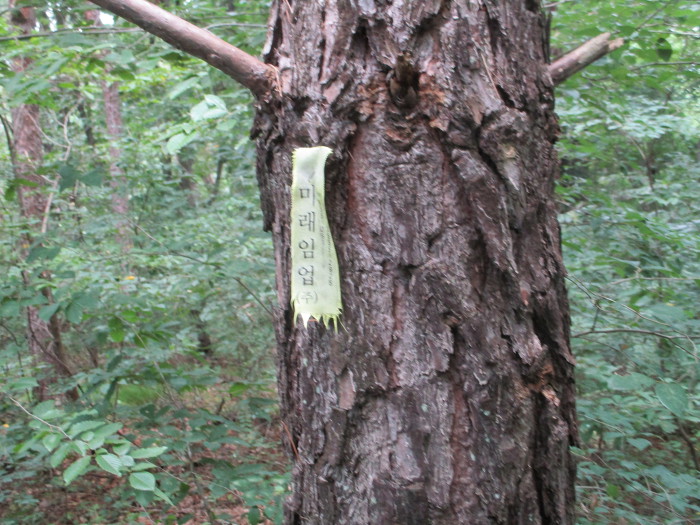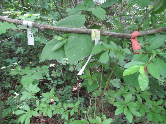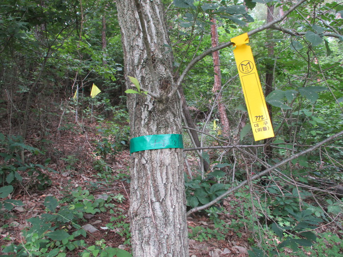 잡목을 후리치가 길을 내노코 흐릿한 족적이 보이는 초입에다 표지기를 걸어 논는다!~ 어?~ 여는 나무에다