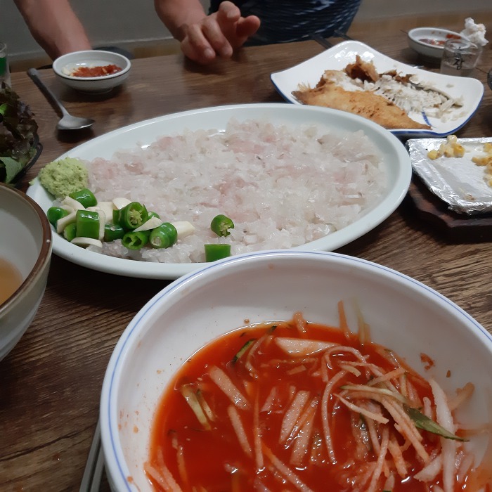 야!~ 총무!~ 해적시났는 옆 반찬은 새로 갈아 돌라 카고 나는 광어 새꼬시 소(小)짜 하나 더 시키라!~