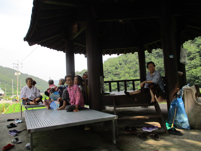 마을회관 앞 정자로 내리와가 앵꼬된 식수를 채우고 할매들 한테 여는 밭 농사도 안짓고 부자만 사나 카미