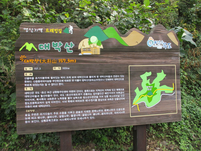 대박산(157.3m)~대박산 이정표 빽~영산기맥트레킹길 안내판~오른쪽 나무계단~