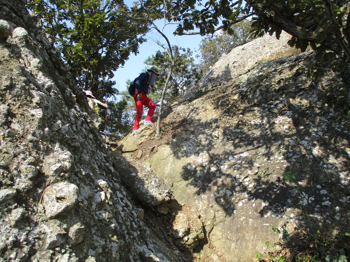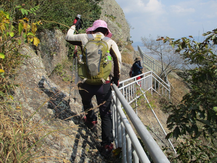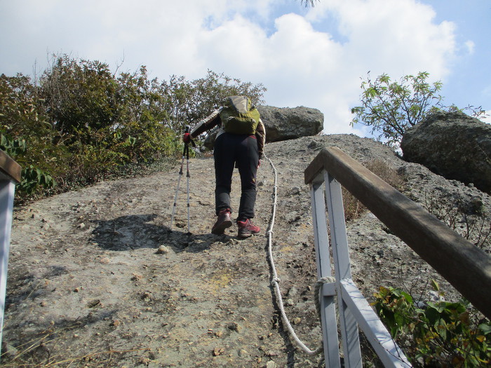 철제 안전 난간이 나타나고 내림길이 보이는데 왼쪽 갓바위봉에 올라가자 카이 아지매는 들은척도 안하고