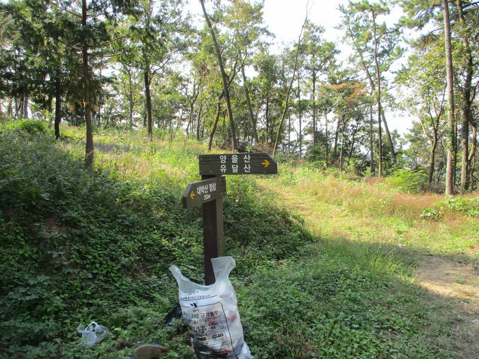 맞은핀으로 대박산 이정표가 보이는 가파른 오름길이 보이가 질러가는 능선 길이 이긴갑따 카미 가파르게