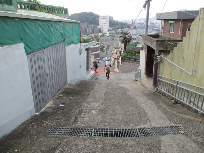 가파른 오름~도로 접속~오른쪽 도로따라~재활용품 분류장 삼거리~오른쪽으로~