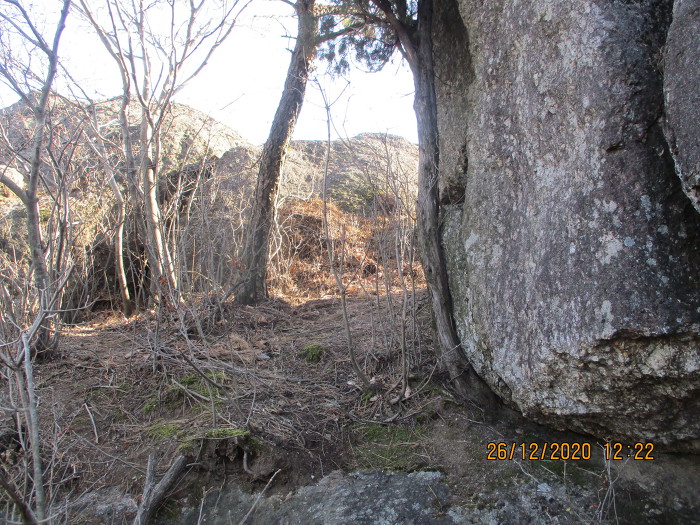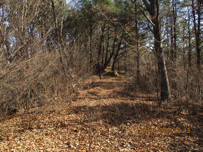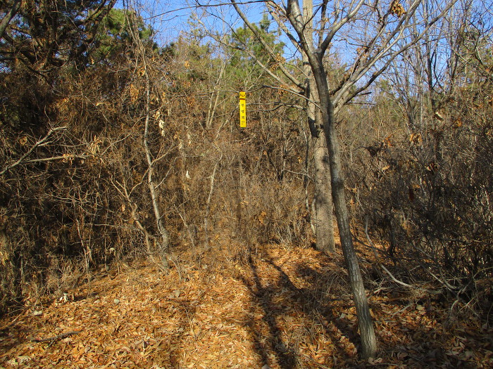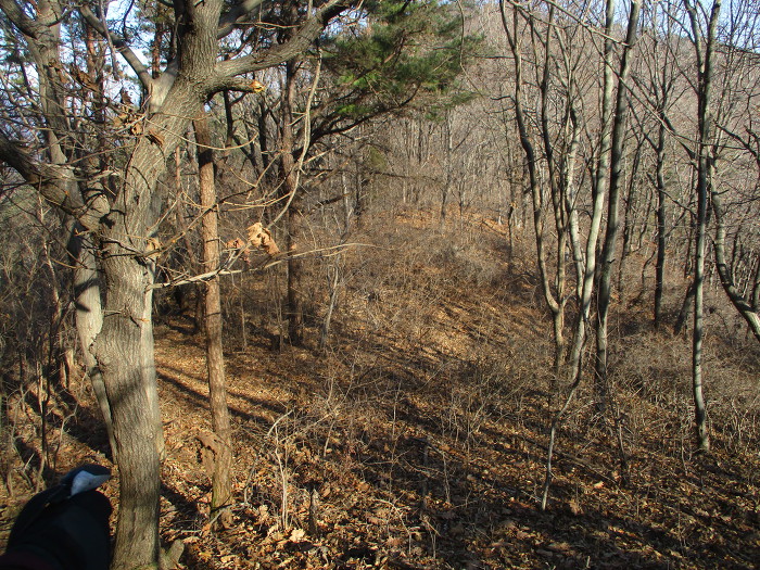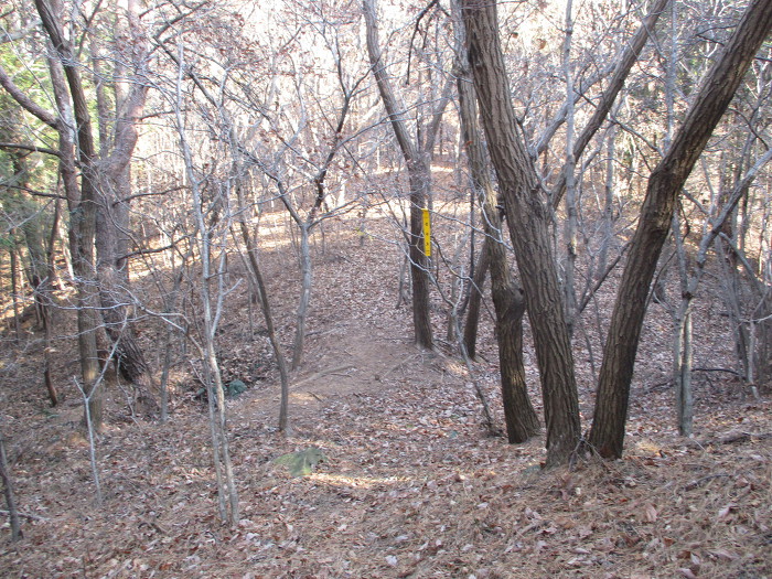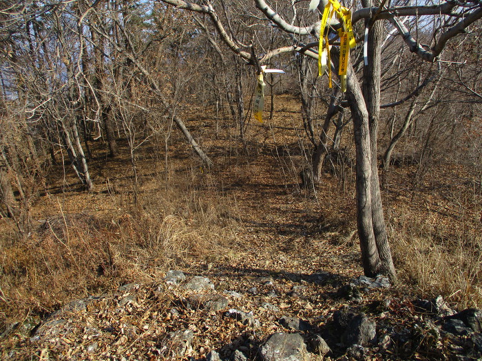 농.임산물 채취금지 팻말 10여m 오른쪽으로 능선 접속~계속되는 오름~집터(?) 흔적~