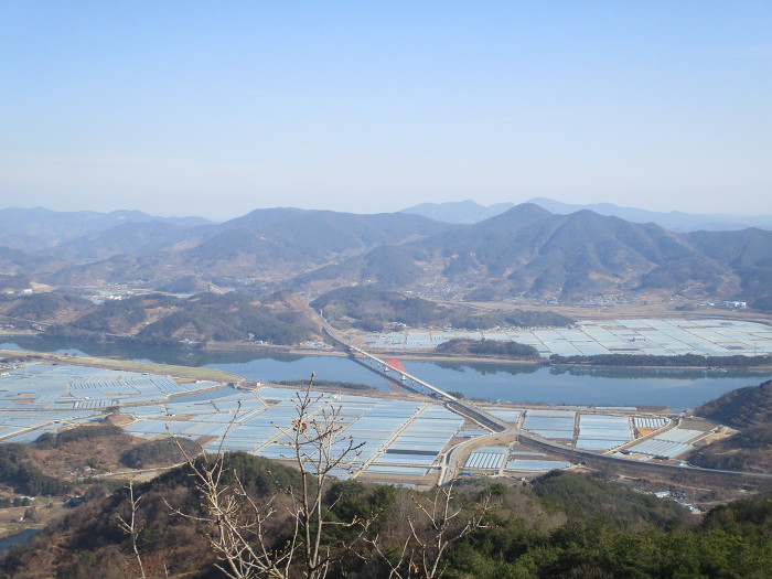 바다로 착각할 만큼 섬진강변 들판을 가득 메운 비닐하우스와 지나온 섬진강교를 내리다 보고, 왼쪽으로
