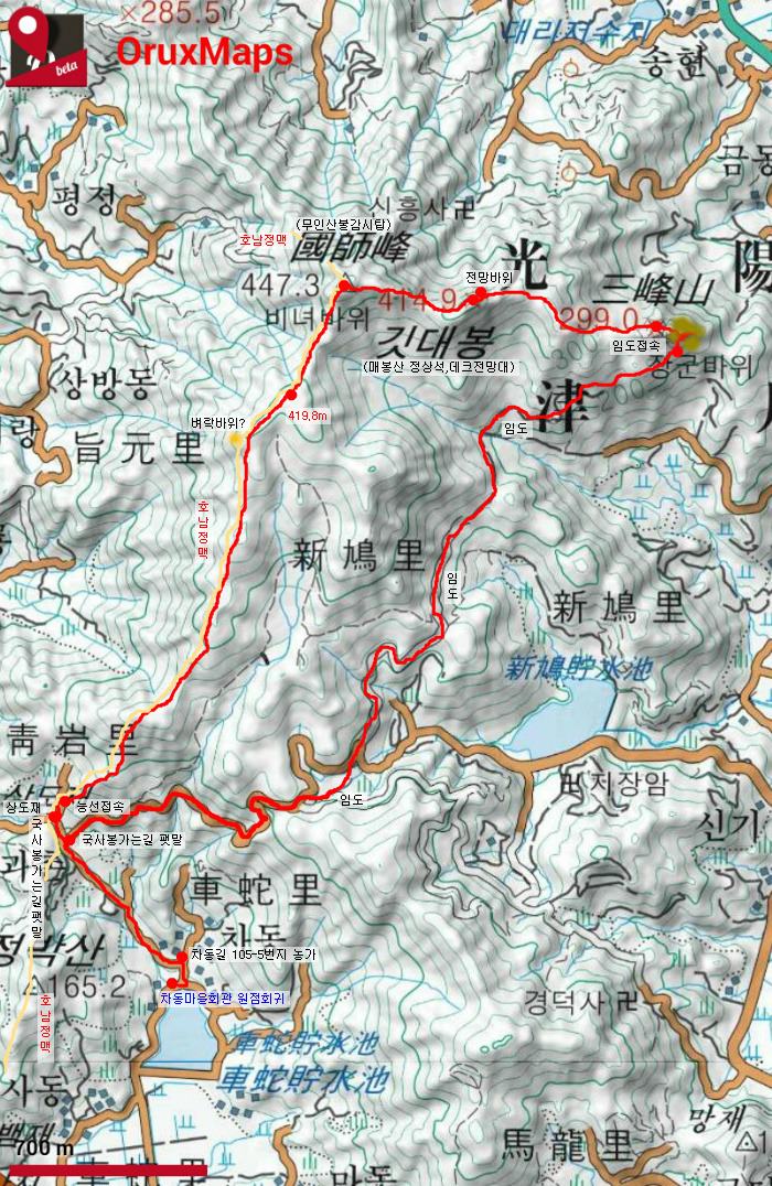잠시후 지피에스가 빌 특징이 없는 봉우리가 삼봉산임을 가리킨다!~