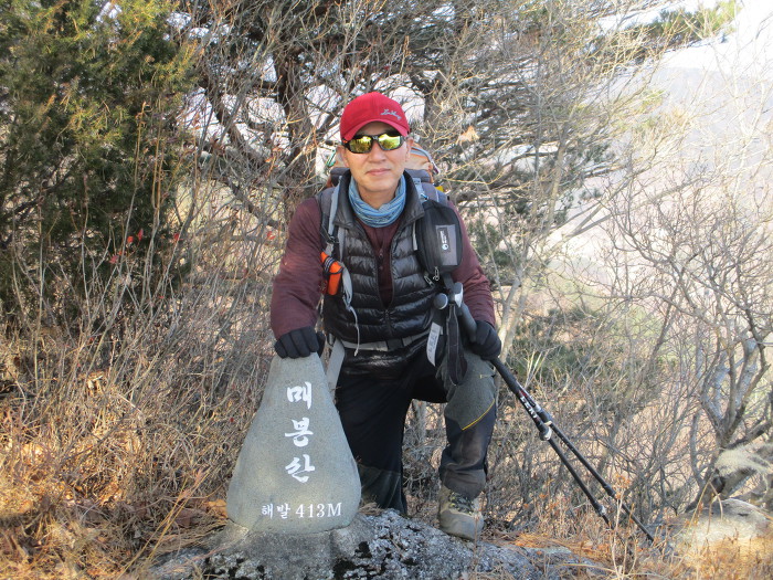 지대 오르내림~깃대봉(414.9m, 매봉산 정상석, 전망데크)~가파르게 내려~바위지대