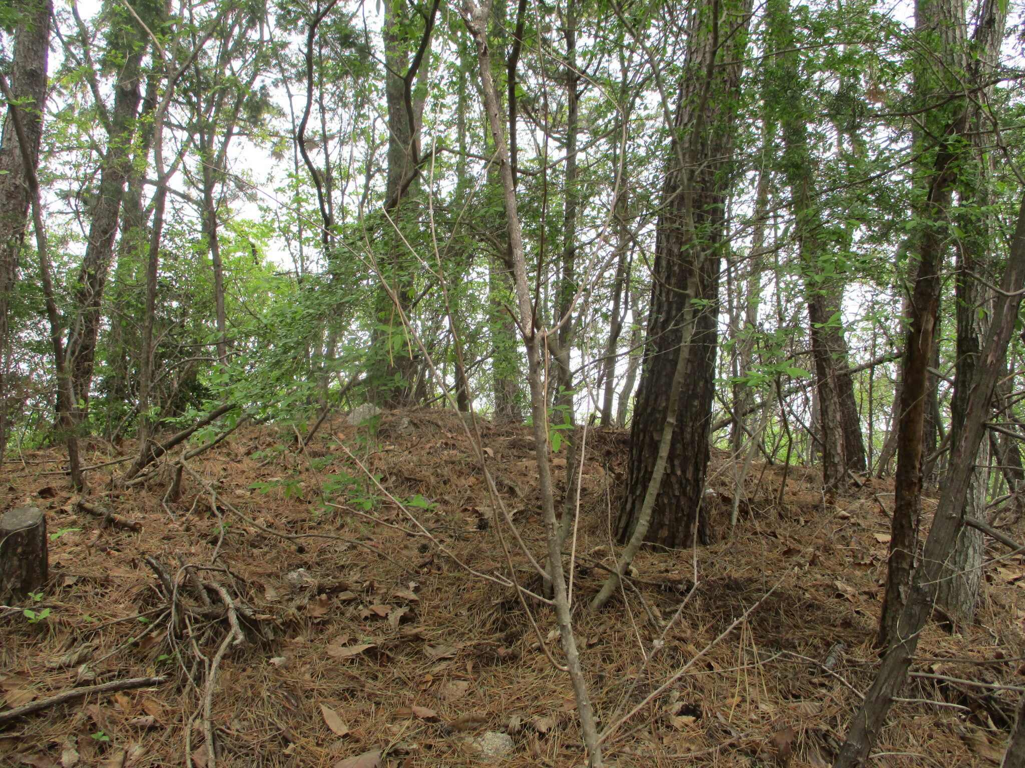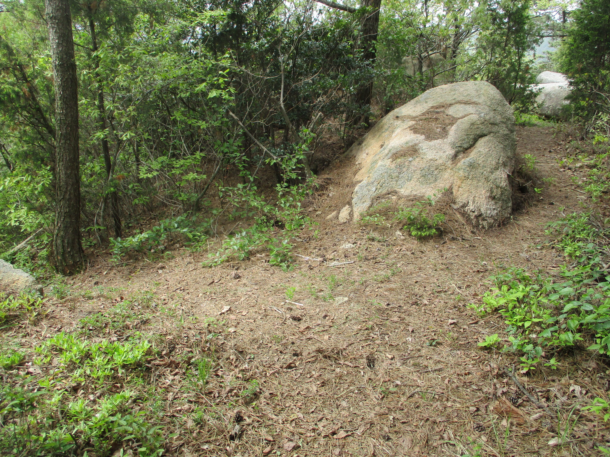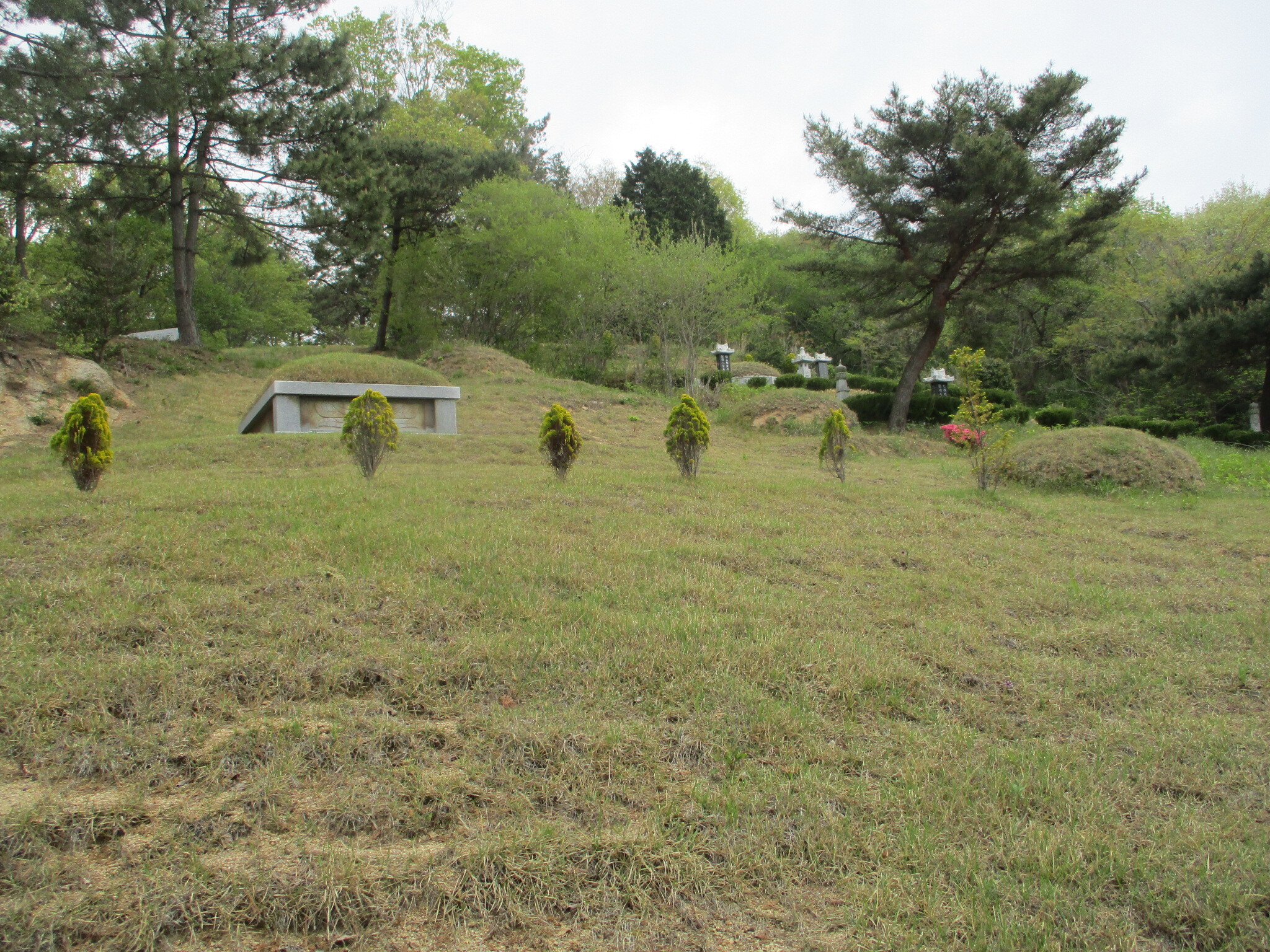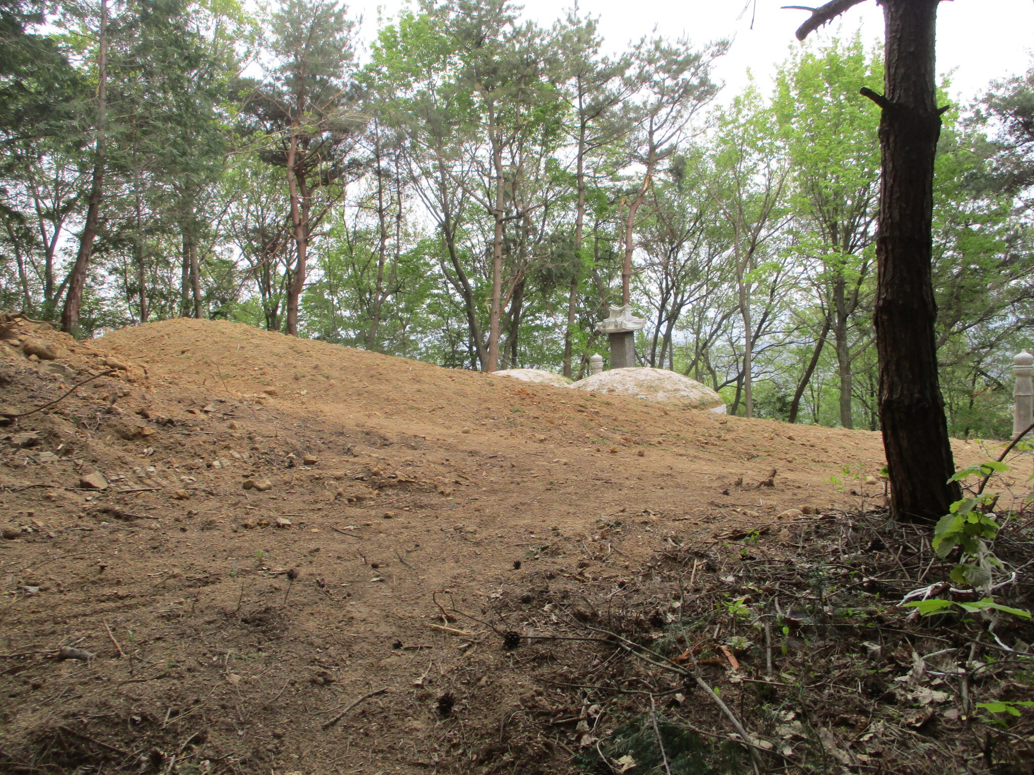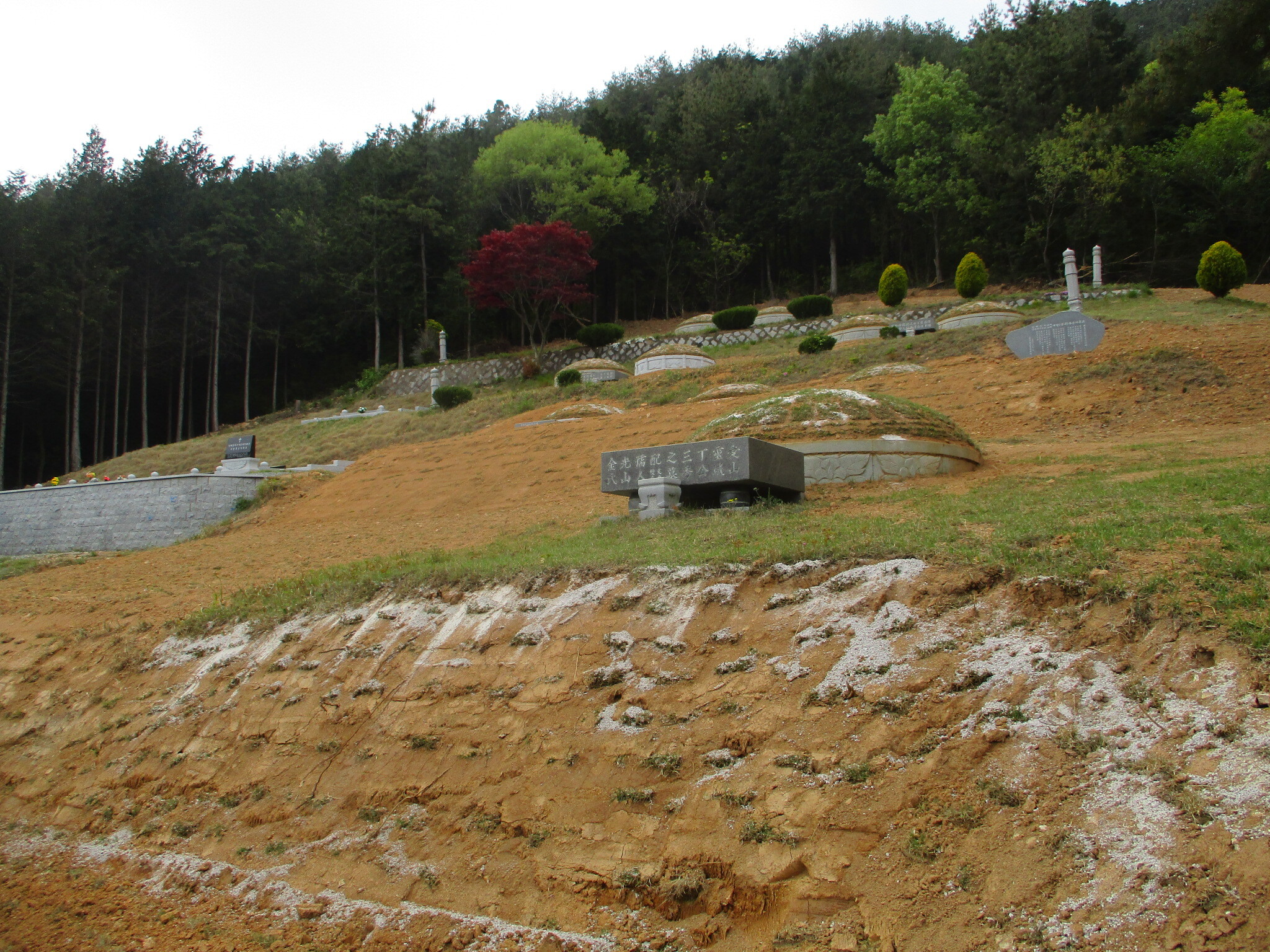 전다지 같은 성씨를 가진 봉분이 쫄로미 누버있다!~ 봉분 우에 허연가리는 뭐꼬?~ 멧돼지 쒜이들이 달기들지 마라꼬