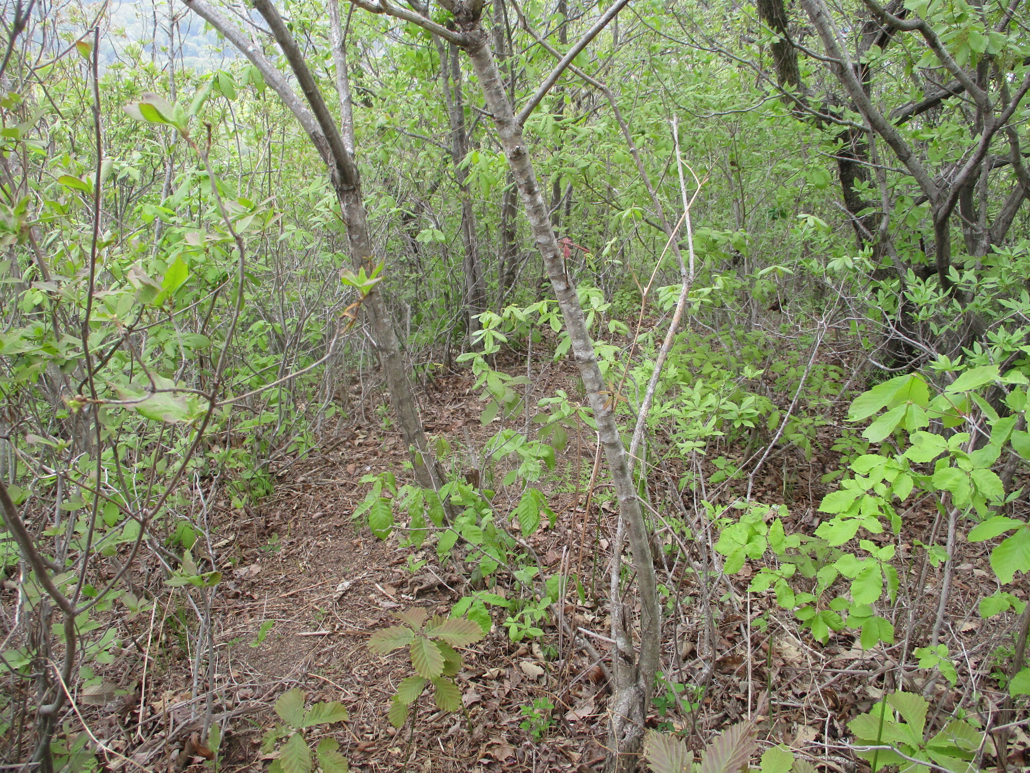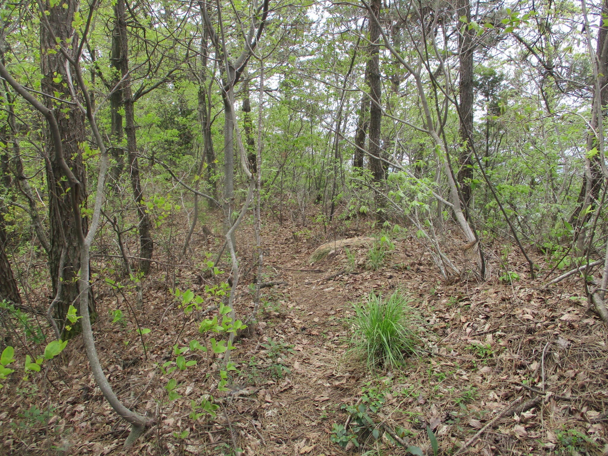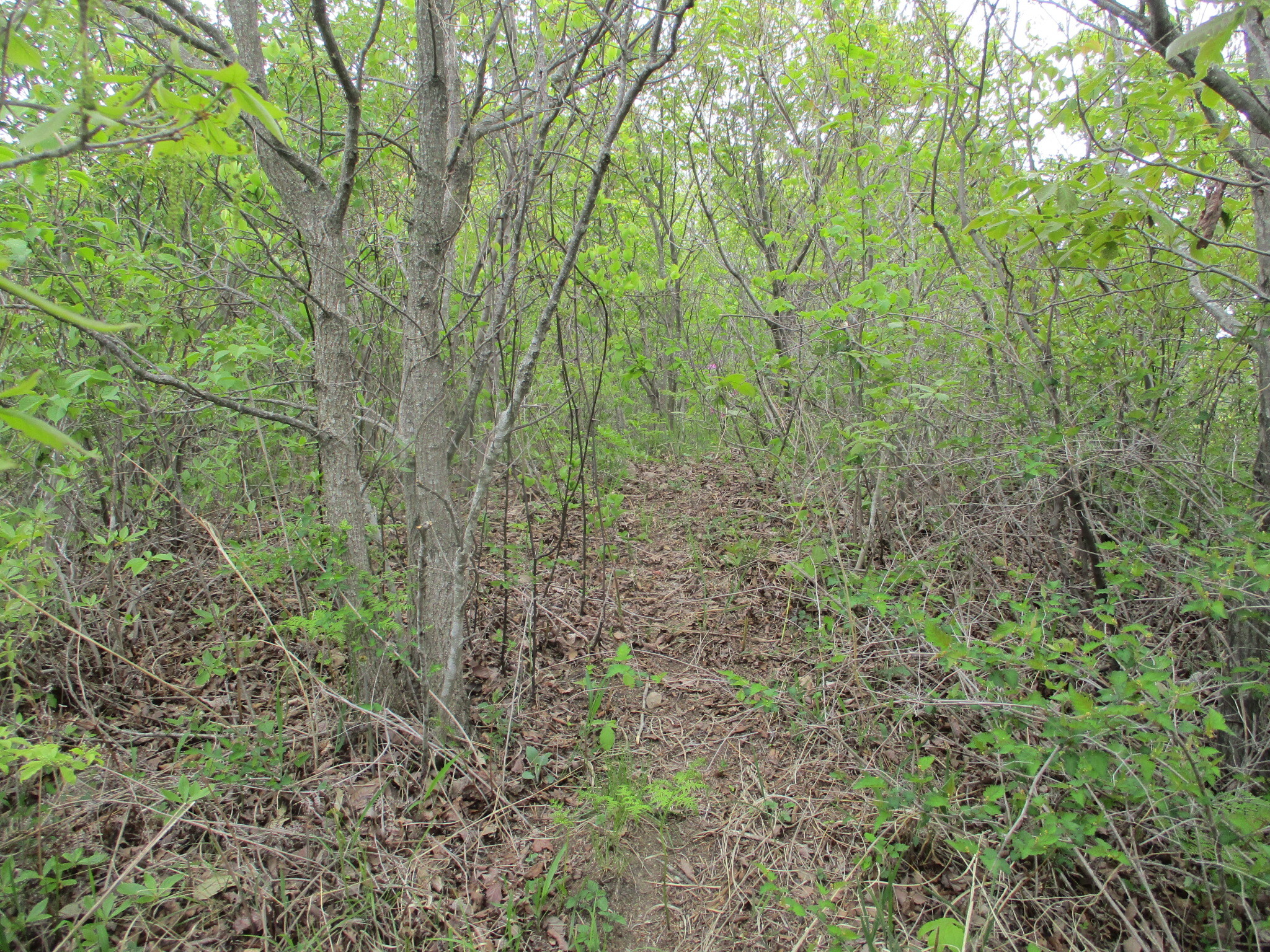 거친 능선으로 치고 오름~능선 접속~여전히 거친 산길~폐초소~왼쪽 안부 철탑 방향 까시잡목