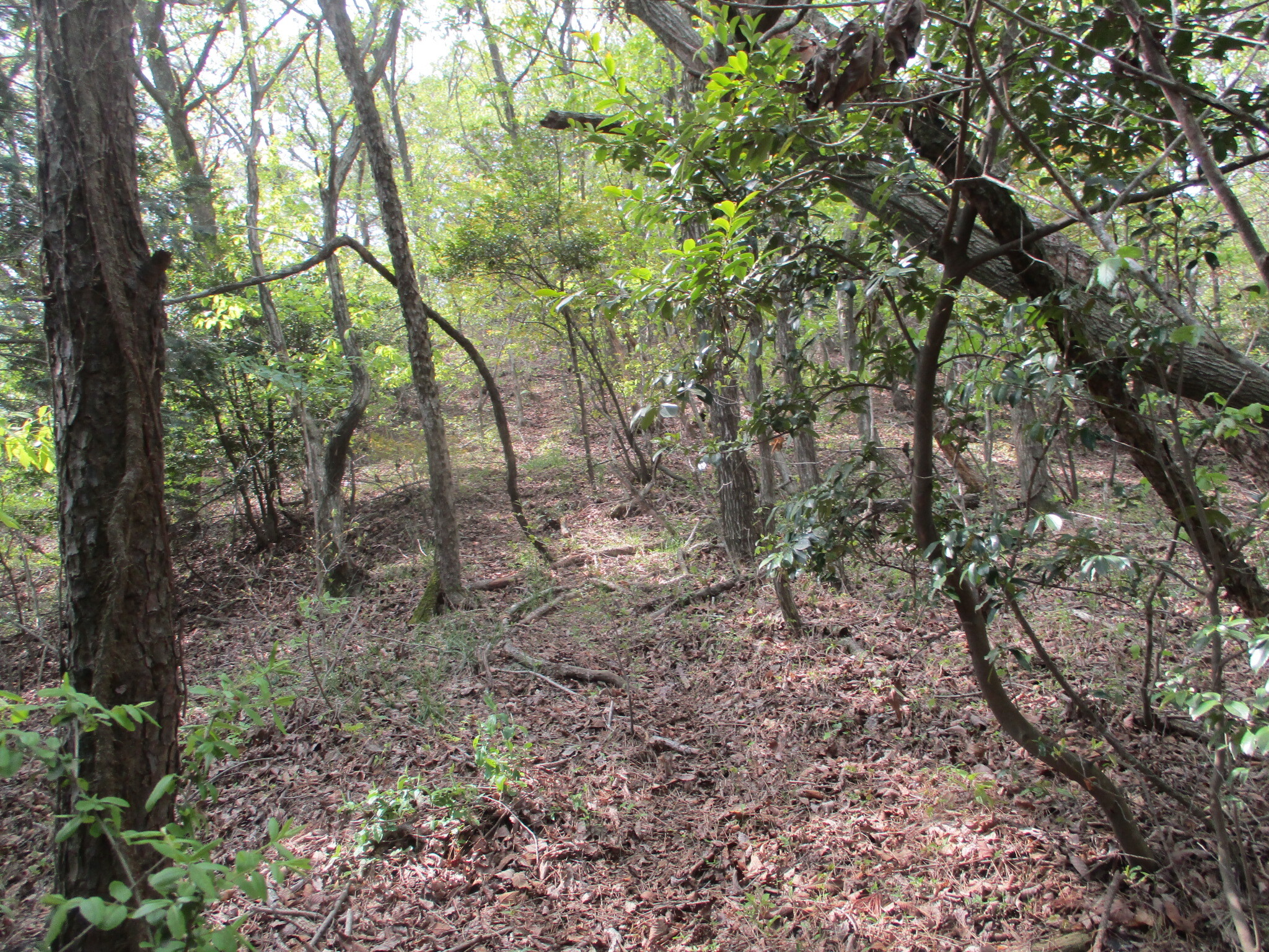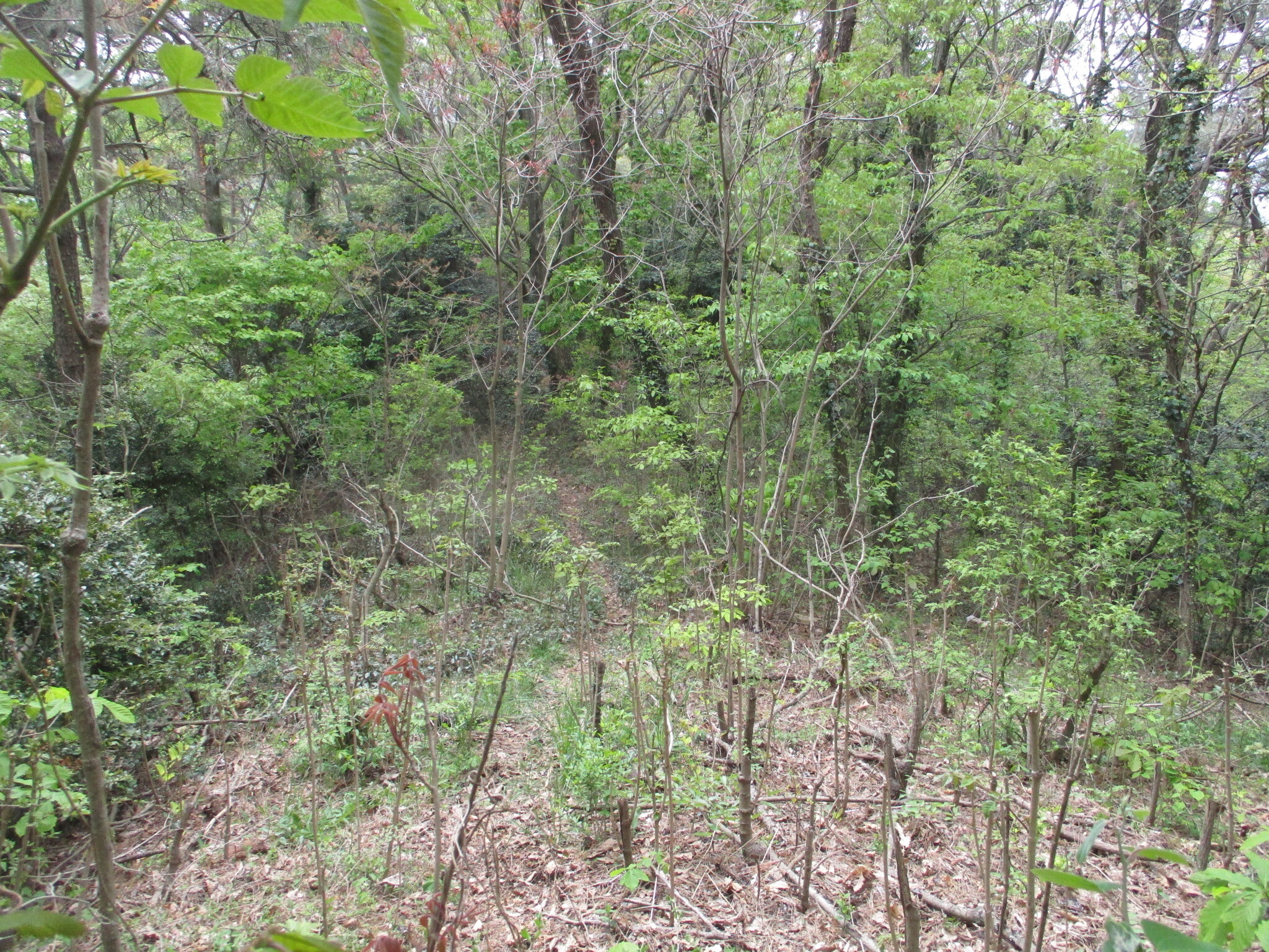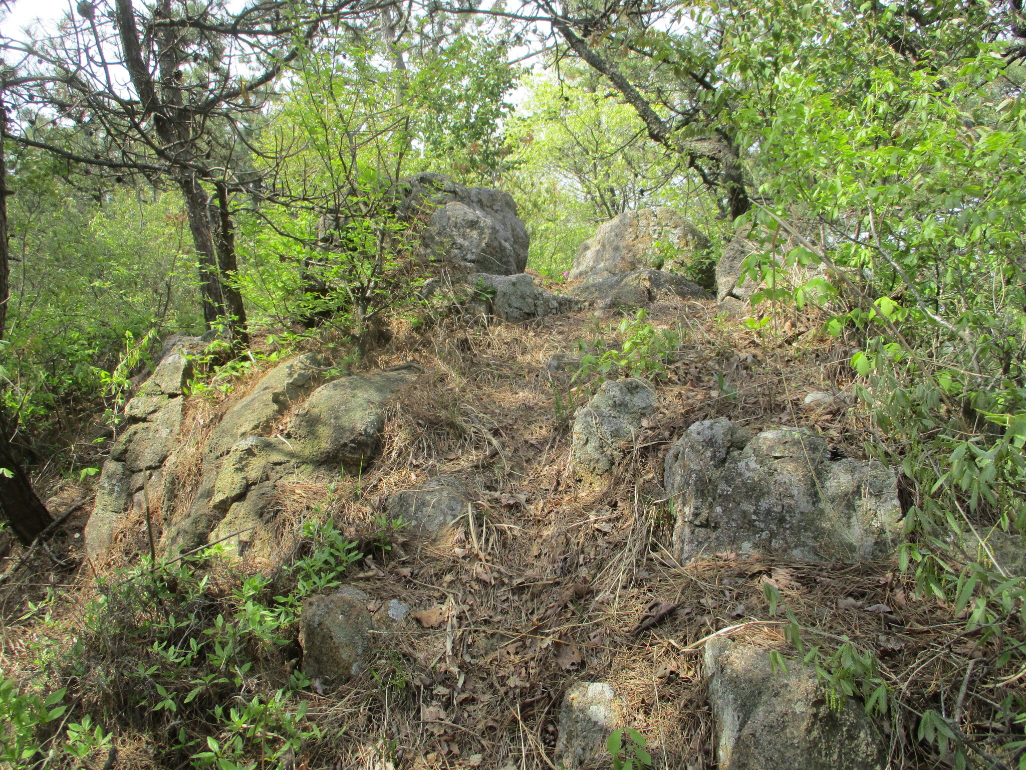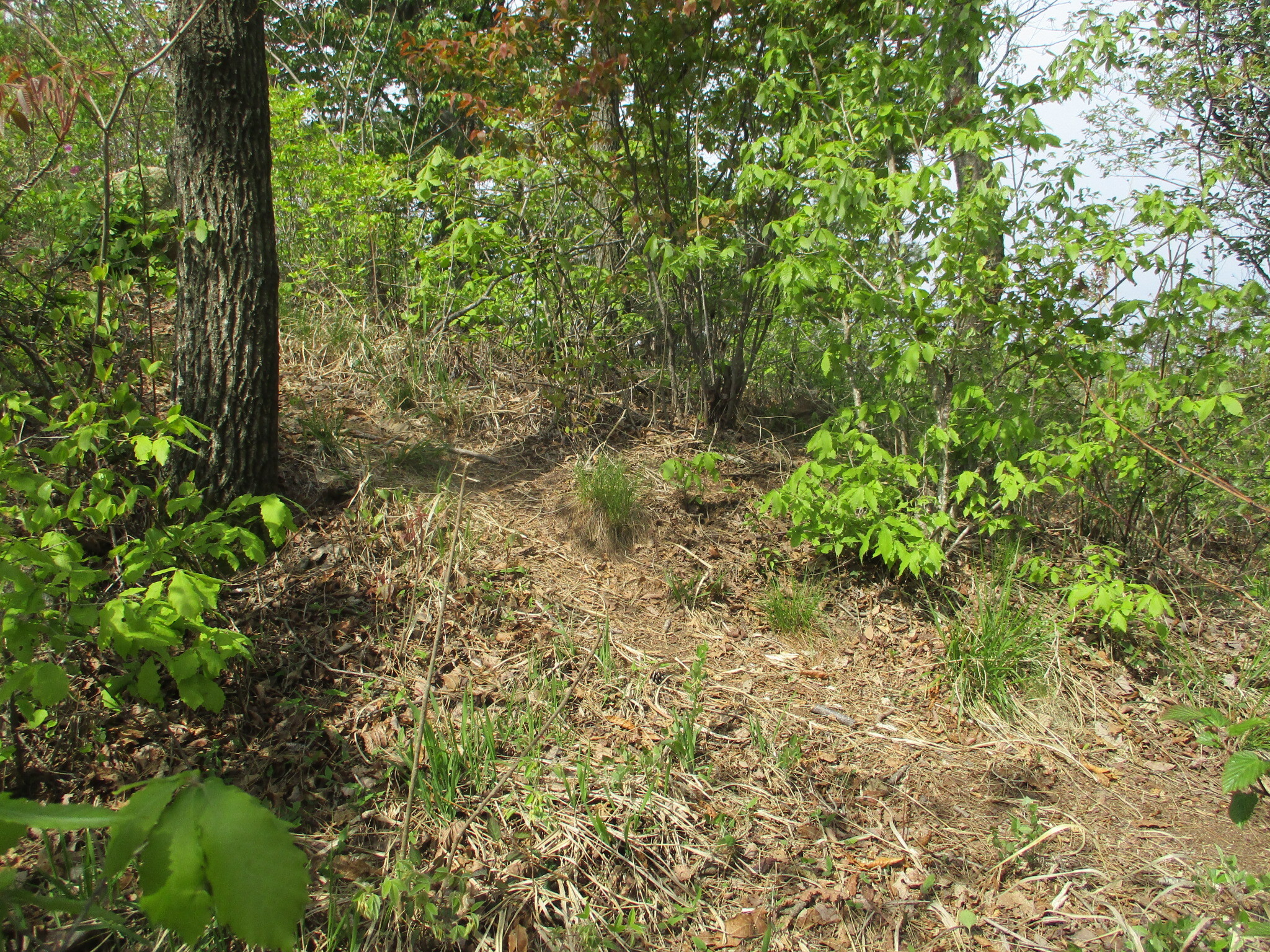 거친 능선으로 치고 오름~능선 접속~여전히 거친 산길~폐초소~왼쪽 안부 철탑 방향 까시잡목