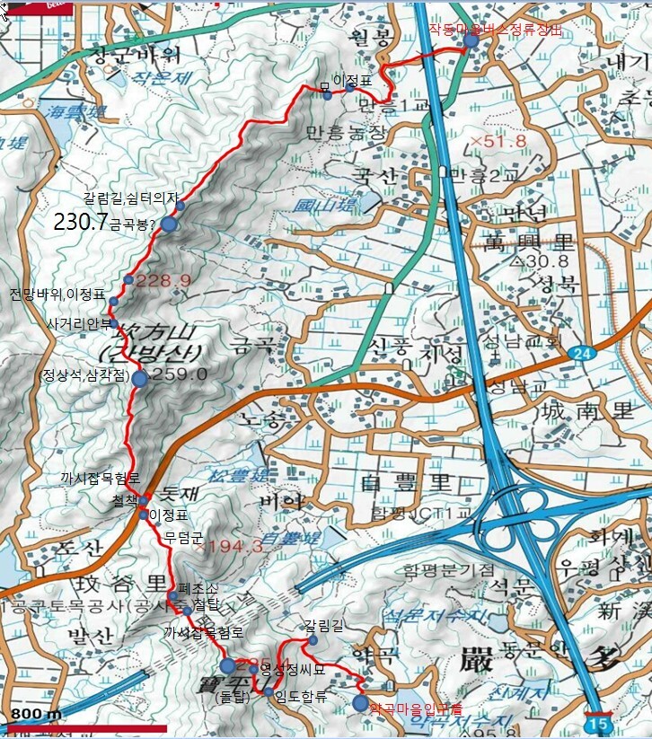 5.산행 경로: 작동마을 버스정류장~창고건물 오른쪽으로~15번 고속국도 굴따리 통과~ 마을 입구에서 왼쪽으로~
