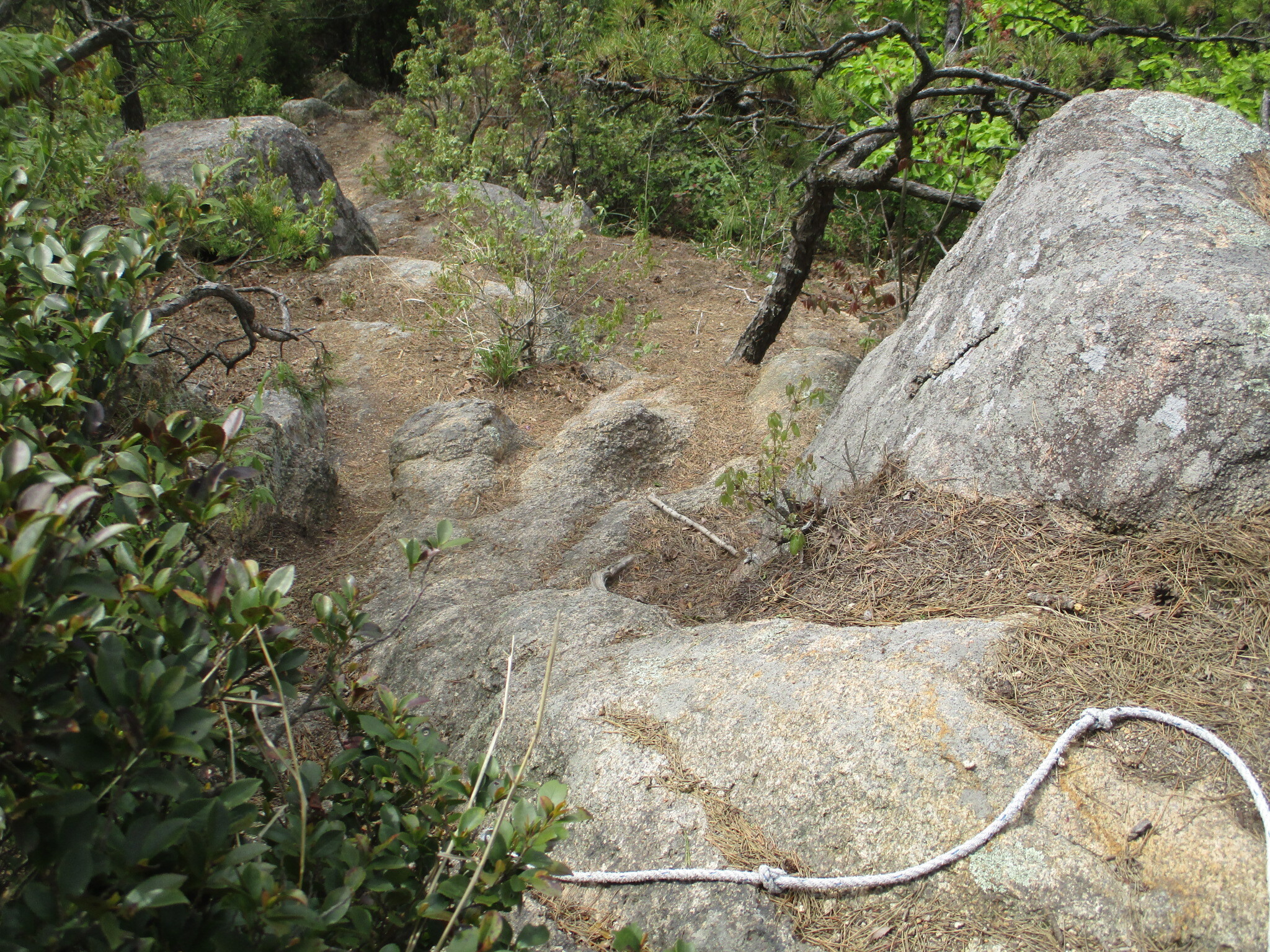 안내도상 표기된 봉명)~바위지대,밧줄~안부~나무계단~바위지대~왼쪽으로 휘어져 내림~전망바위,