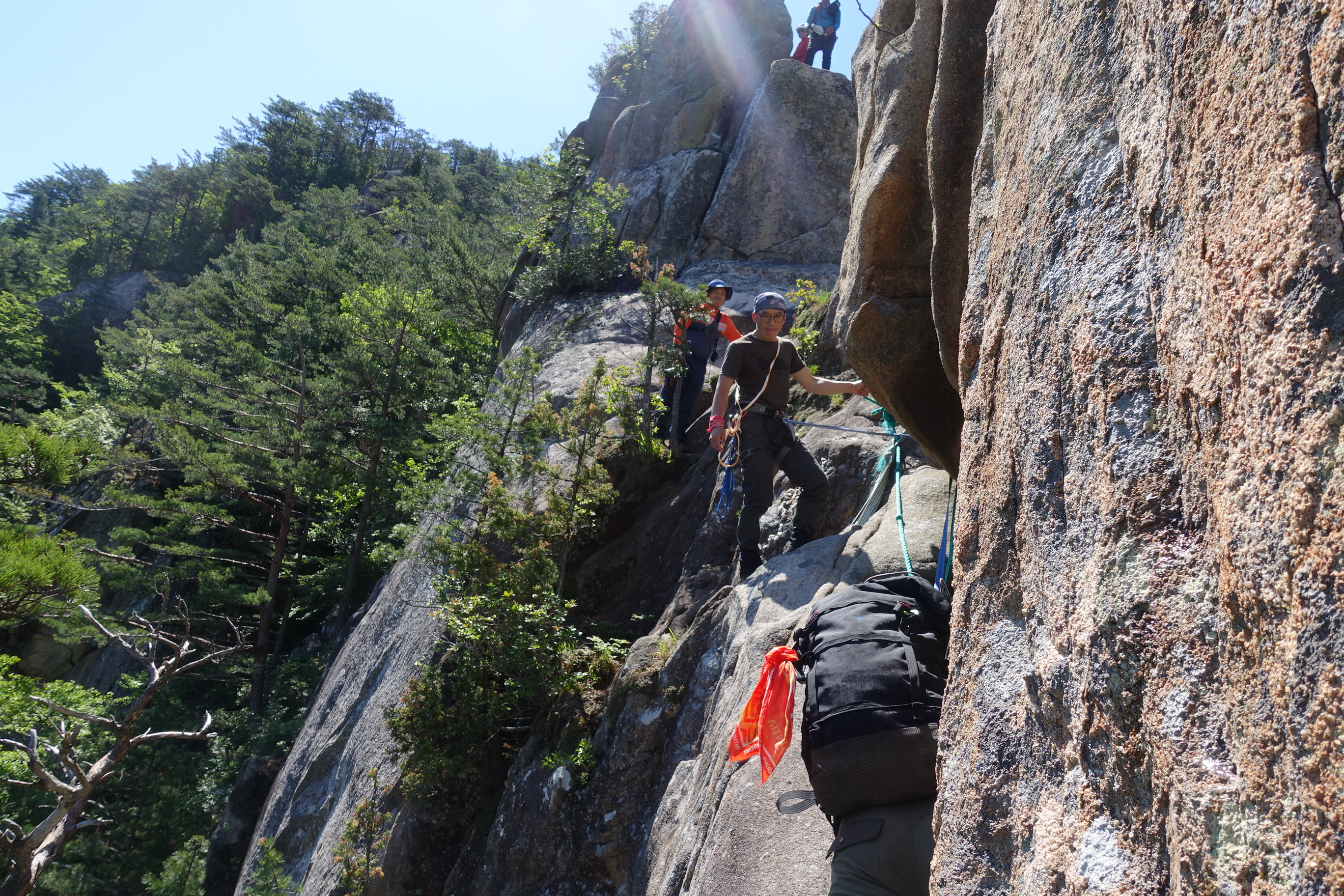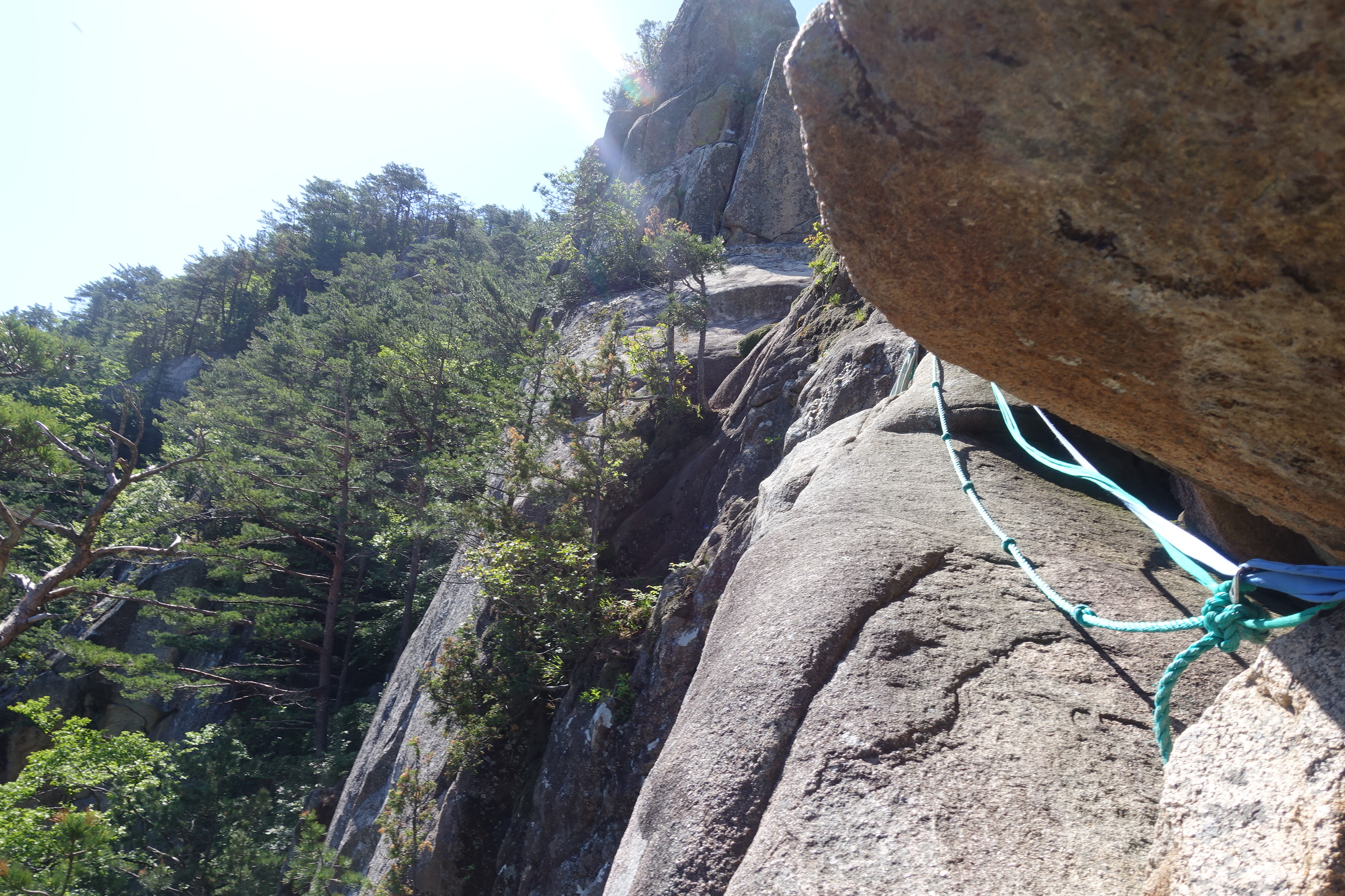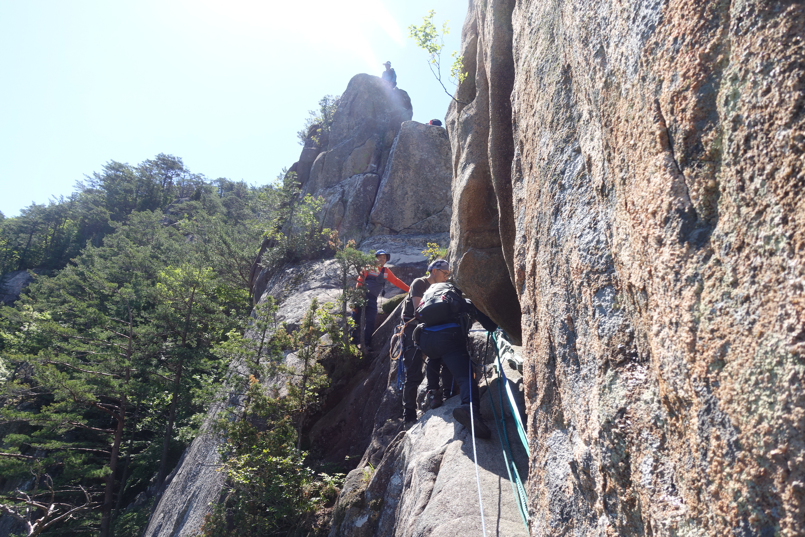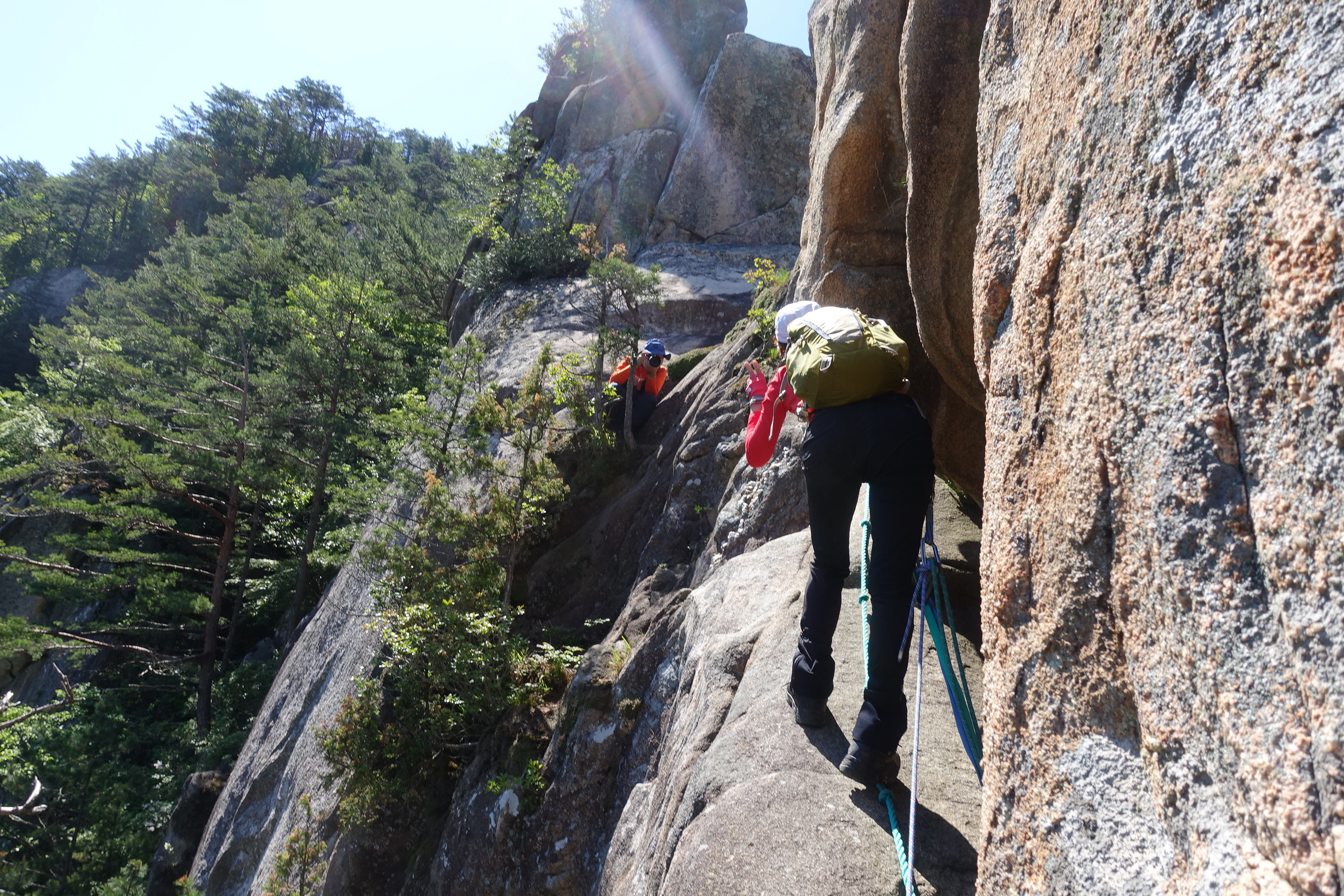 한가닥 로프에 의지하여 오르는 직벽 구간~