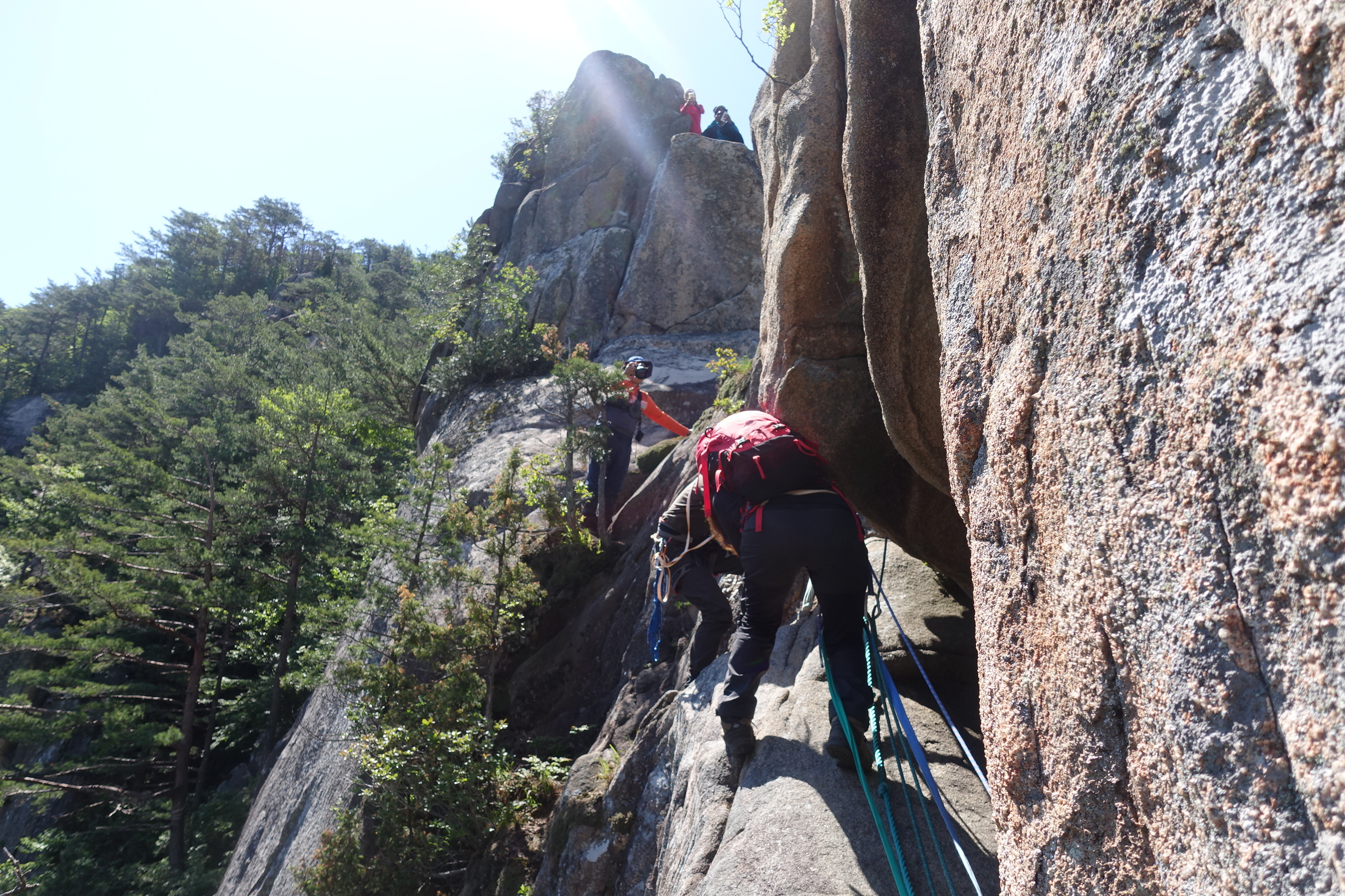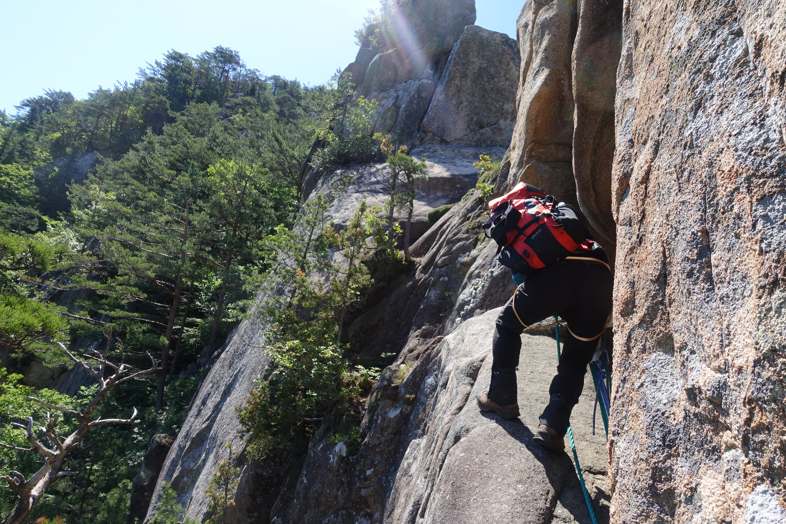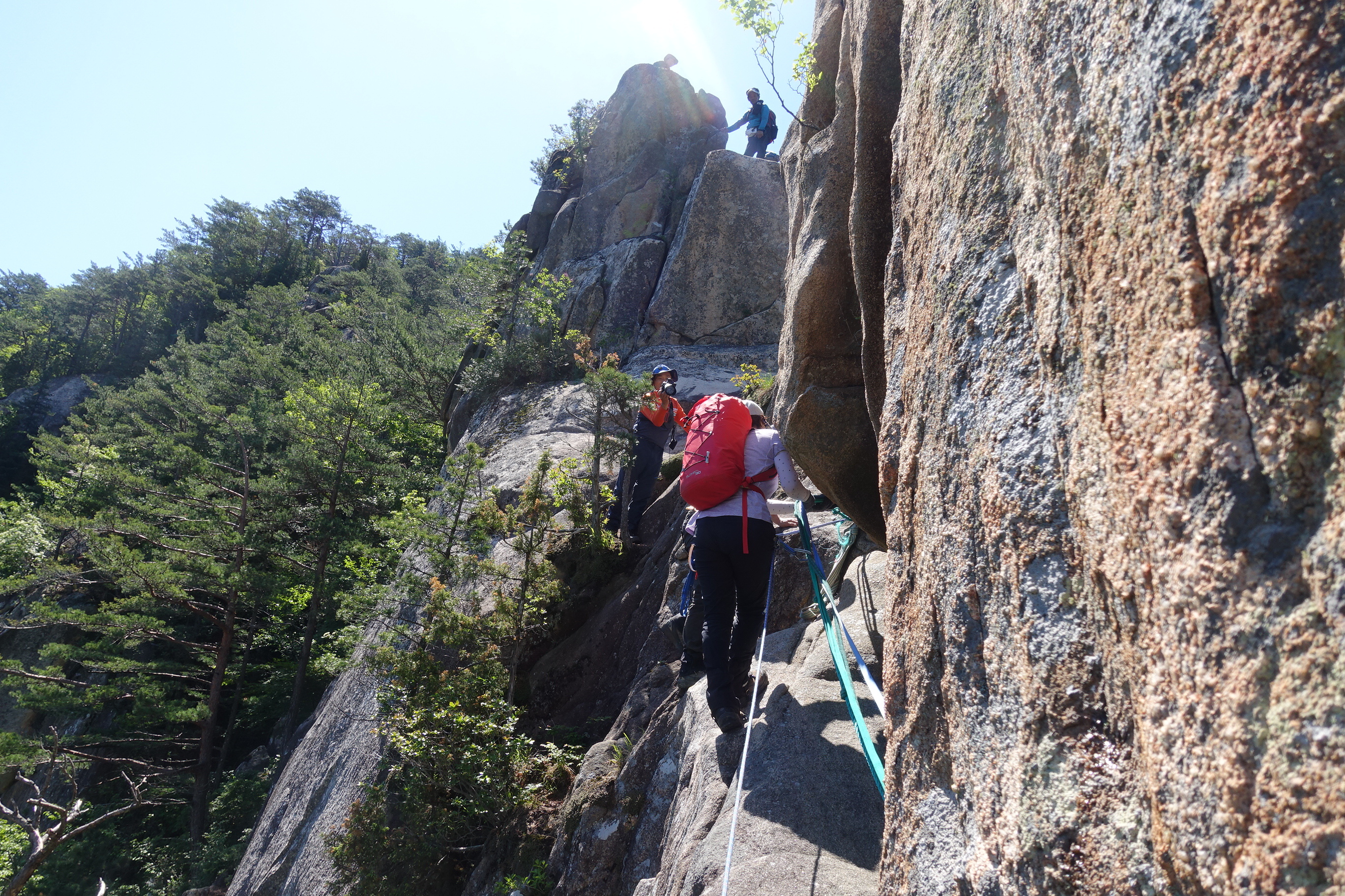 한가닥 로프에 의지하여 오르는 직벽 구간~