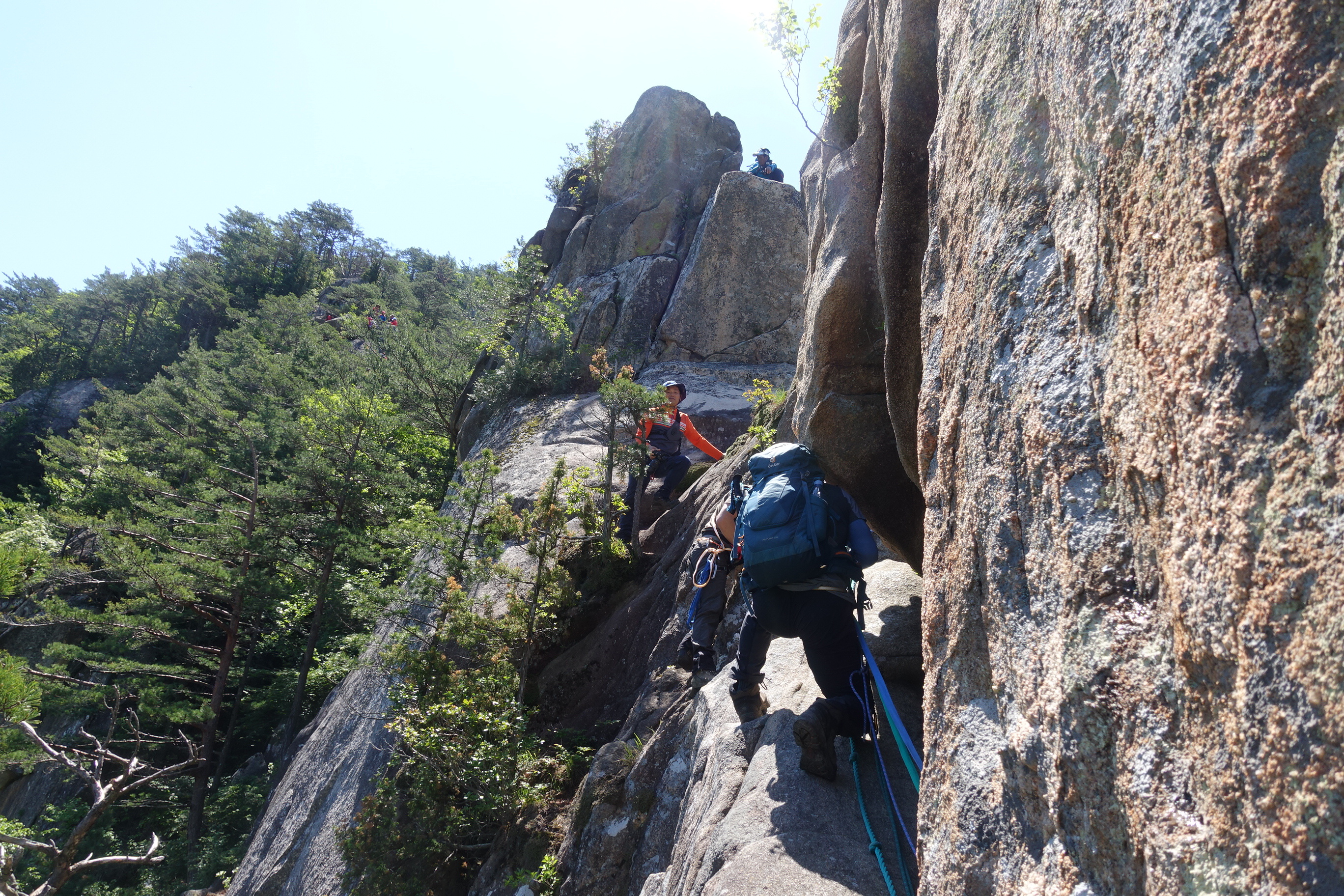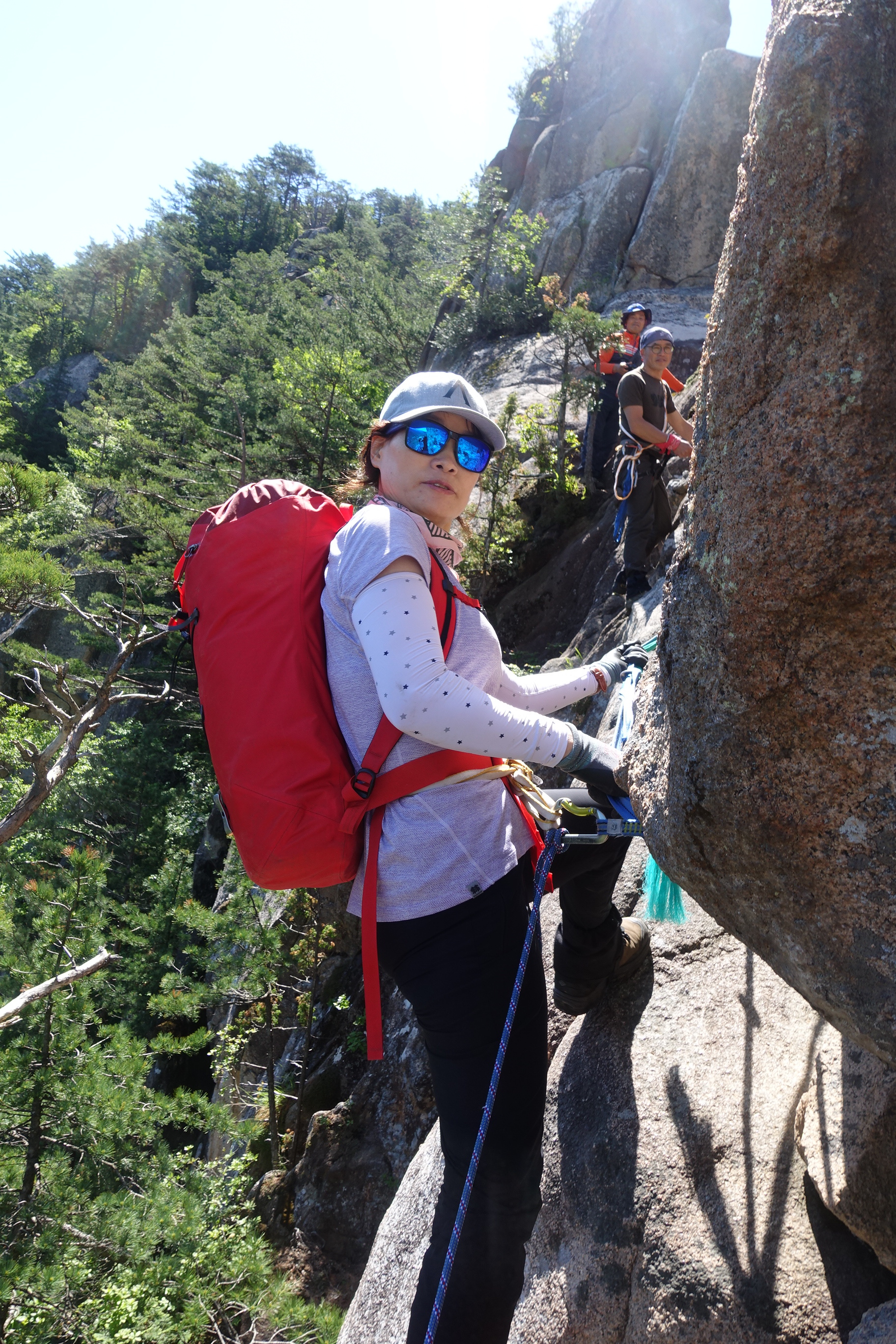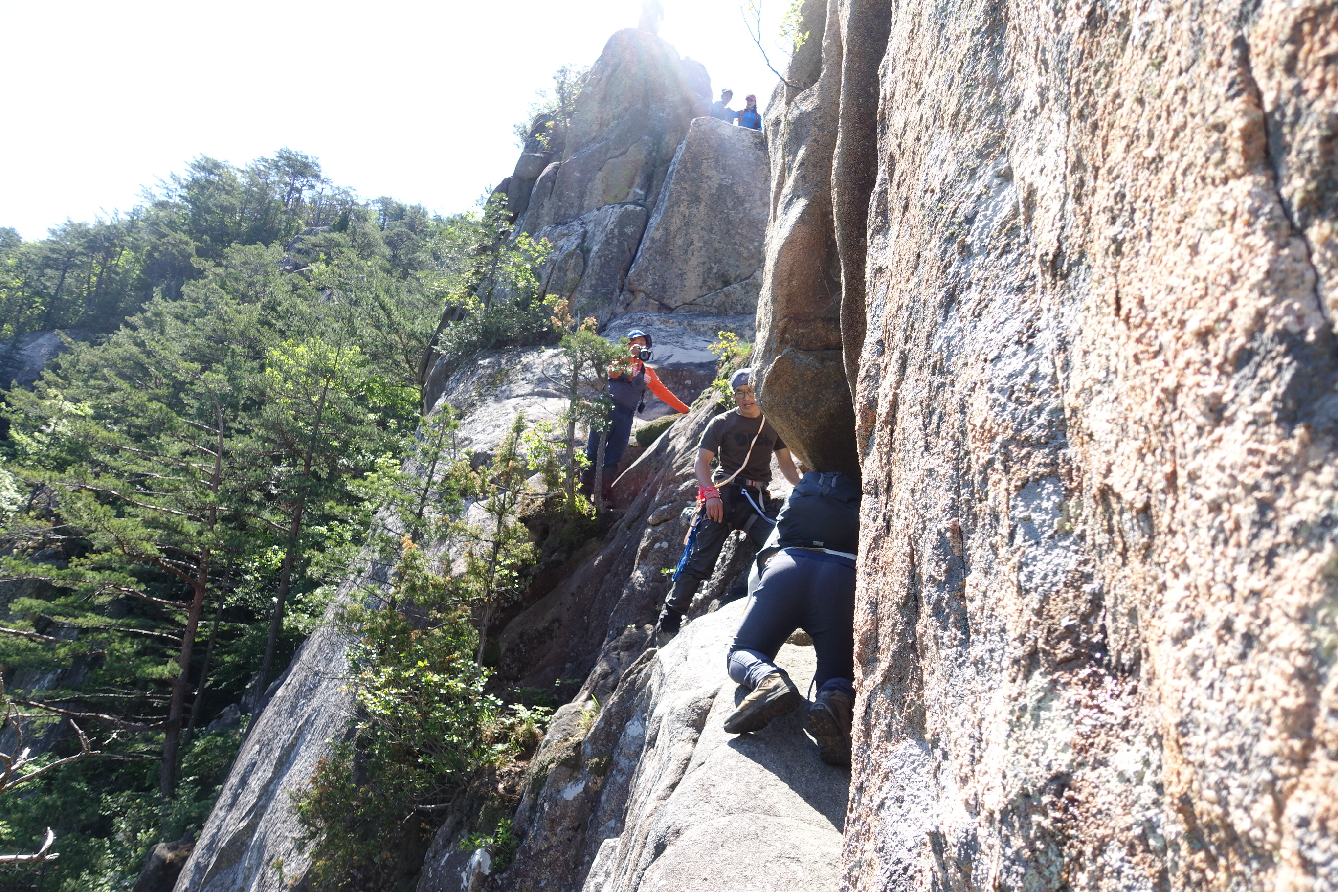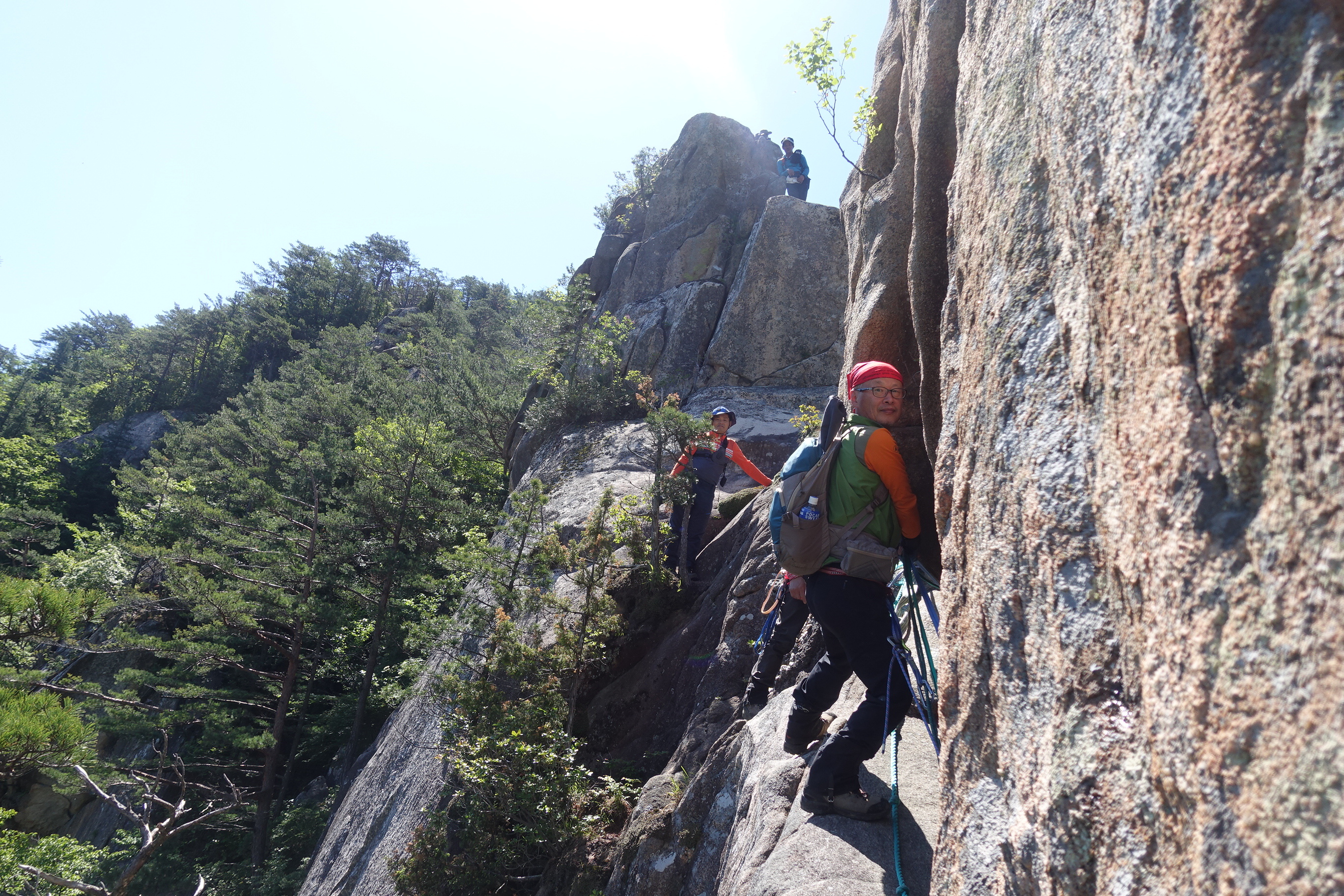 한가닥 로프에 의지하여 오르는 직벽 구간~