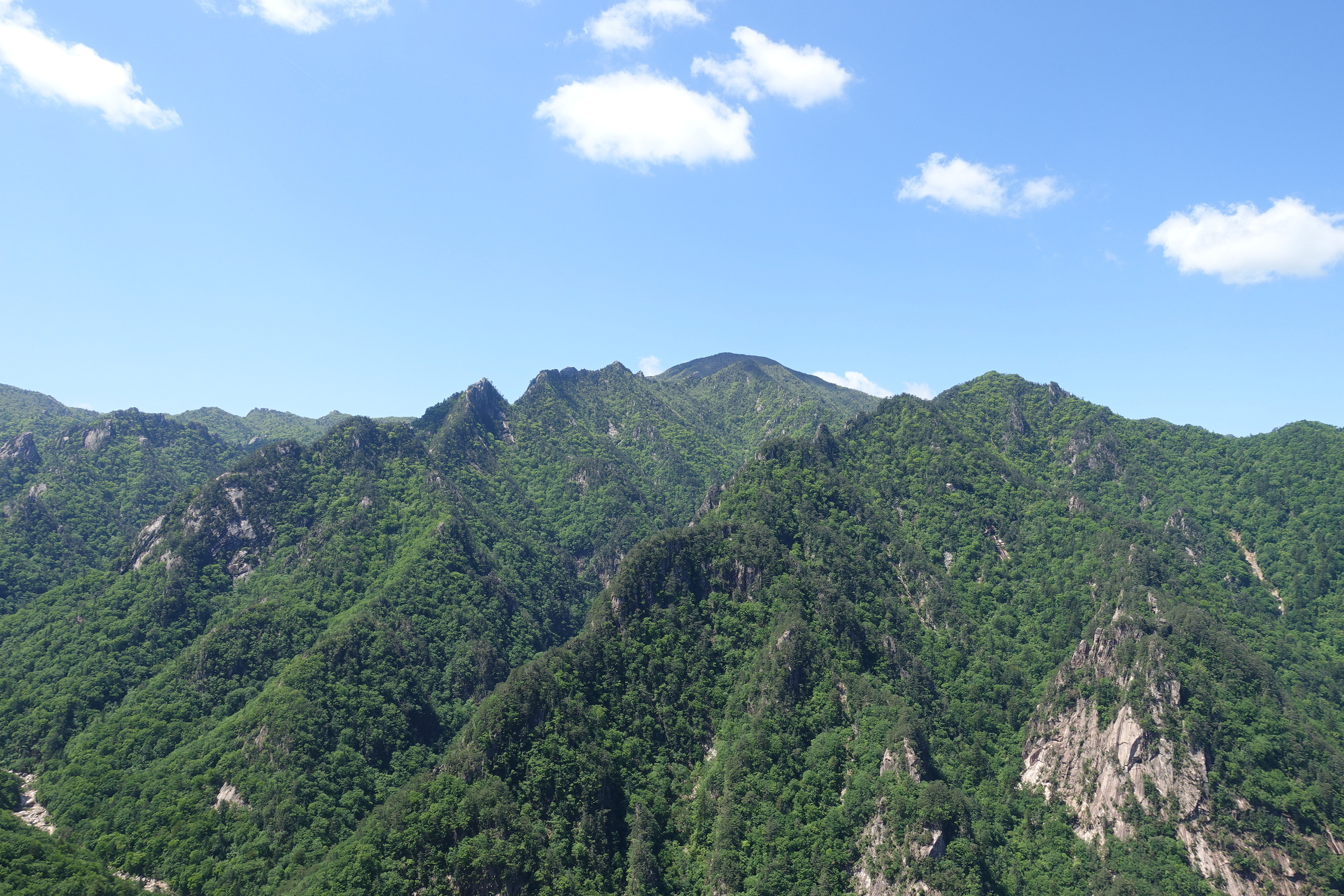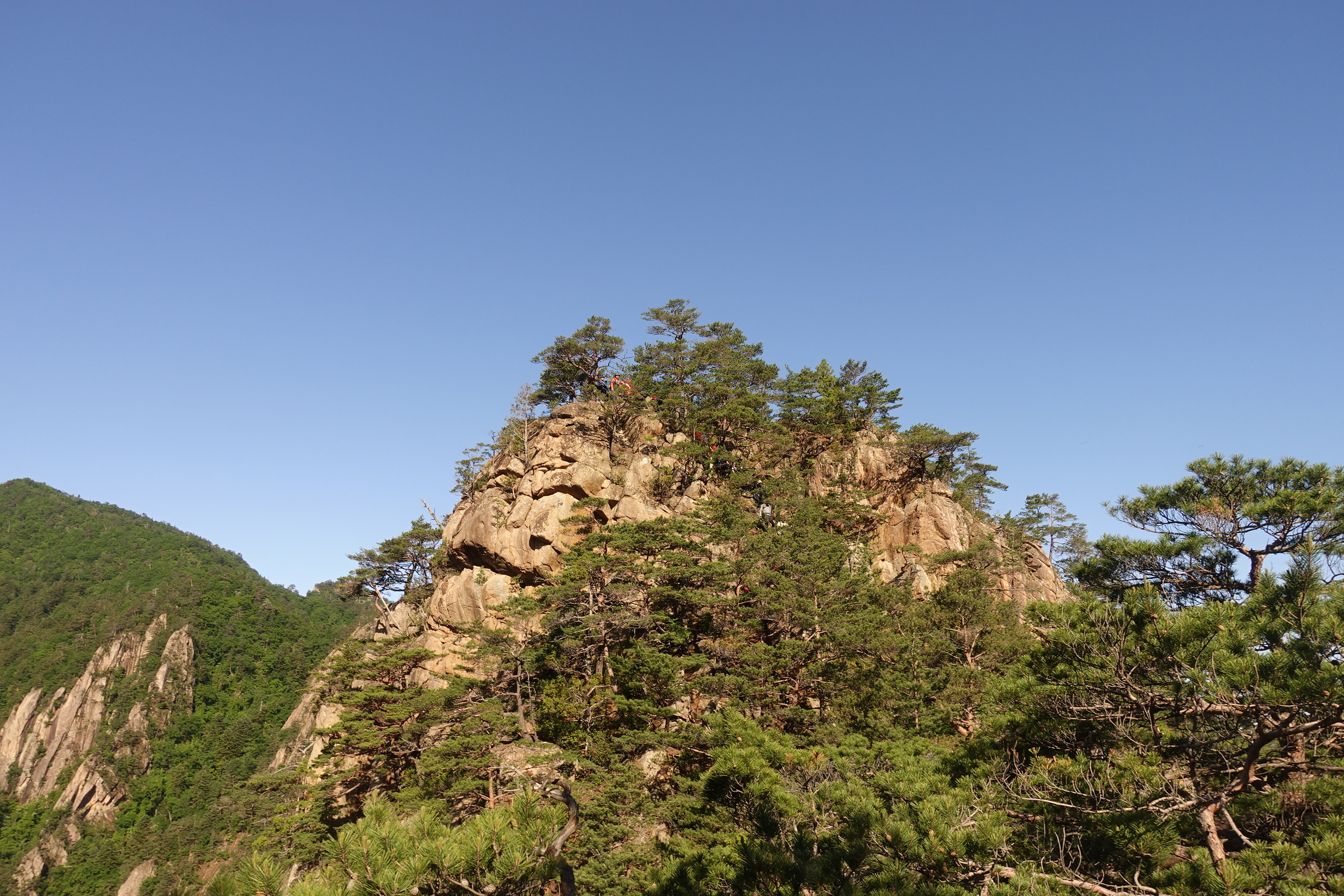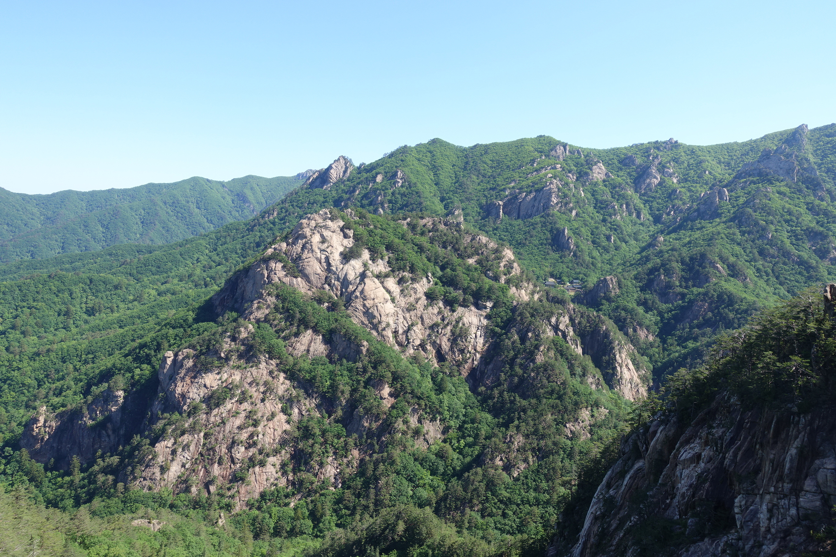 뜀바위에서 바라 본 개구멍(오른쪽에 보이는 쌍두 암봉)