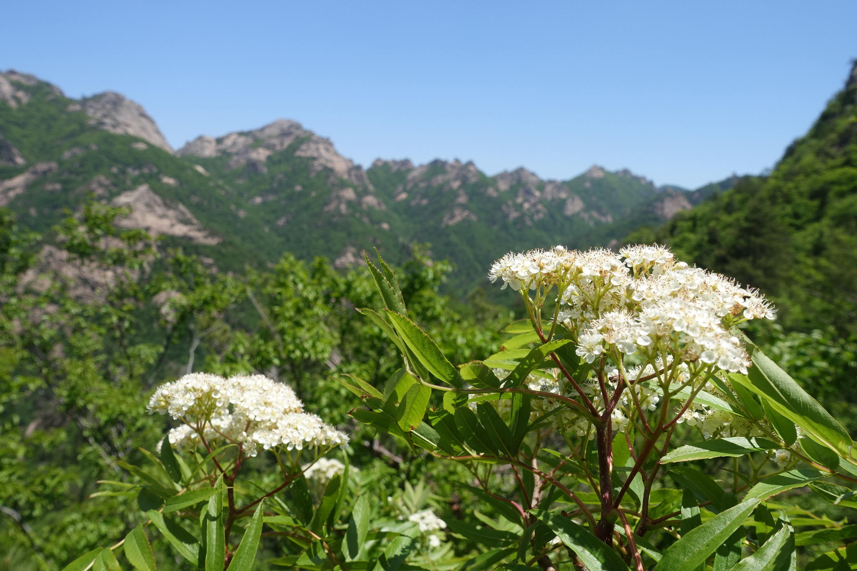 가을에 빨간~ 열매로 변할 마가목의 꽃~ 배경에 보이는 암릉은 공룡능선이다.