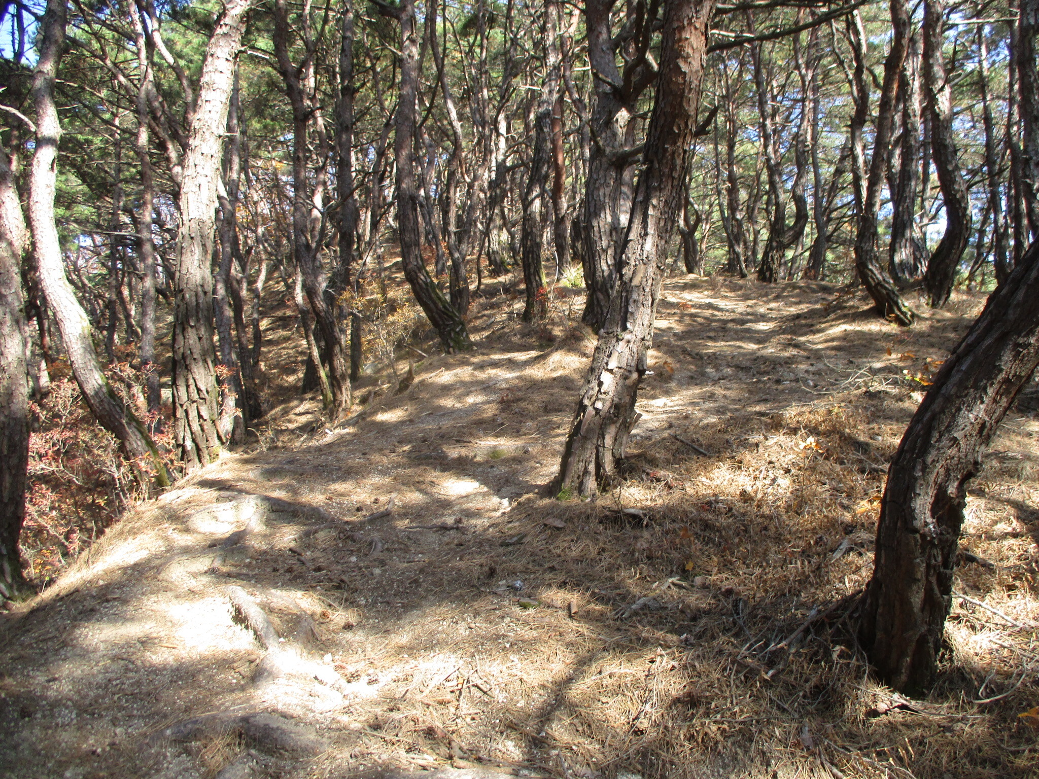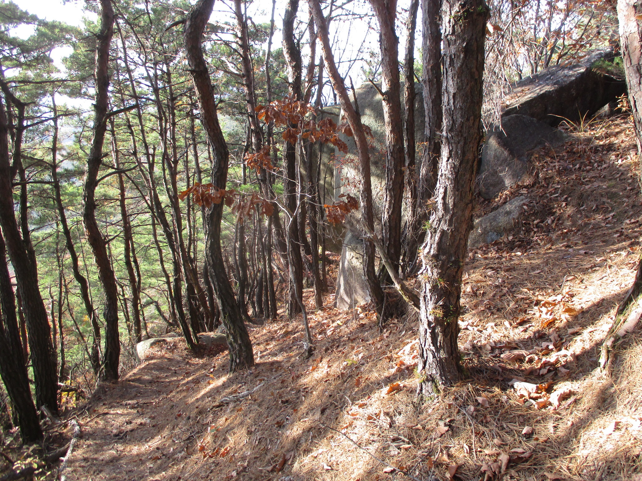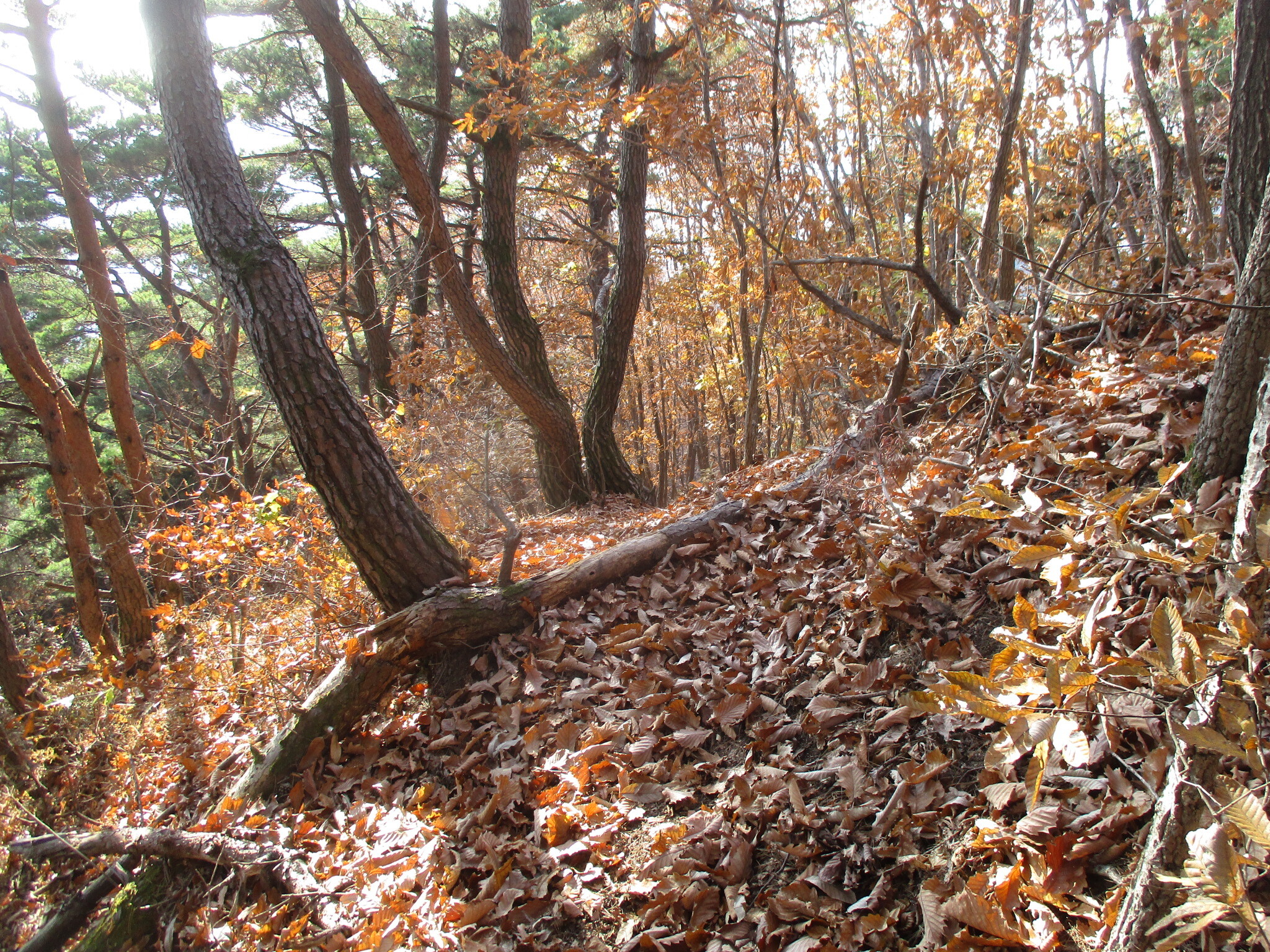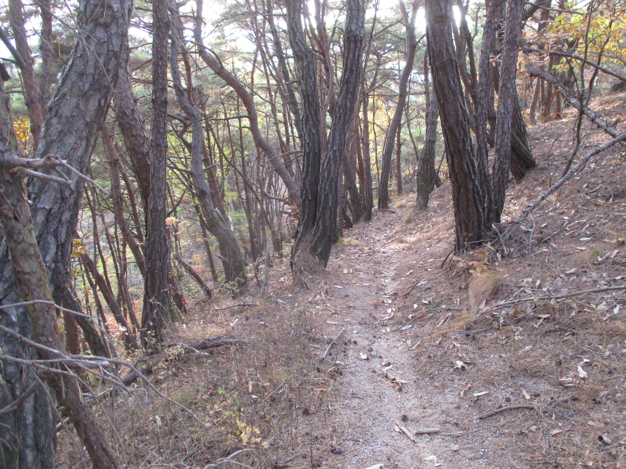 흐릿한 사면으로(갈림길 주의)~굽은 소나무,넘어진 소나무 연이어 지나~다시 왼쪽 사면으로 우회~다시 만나는