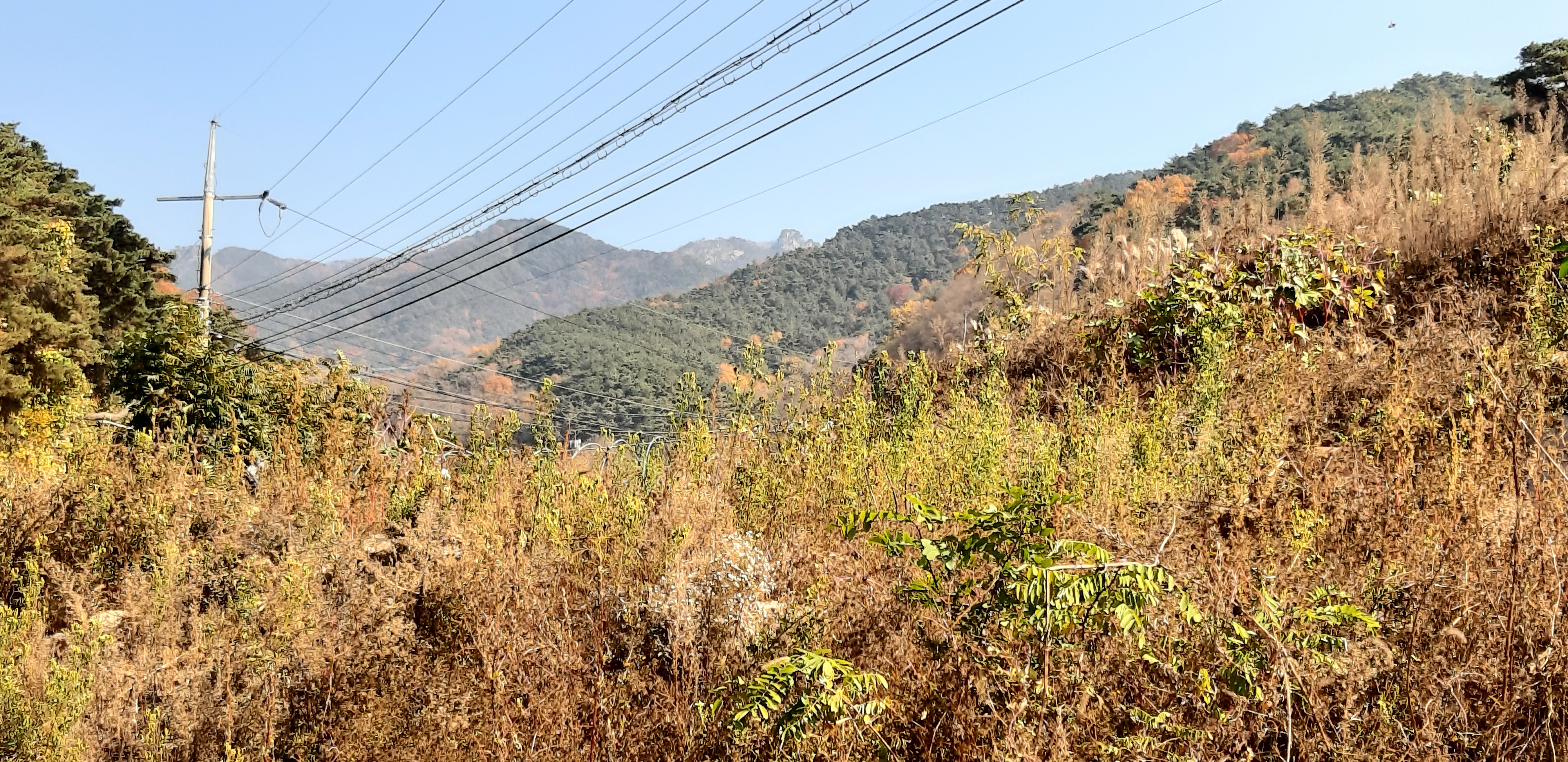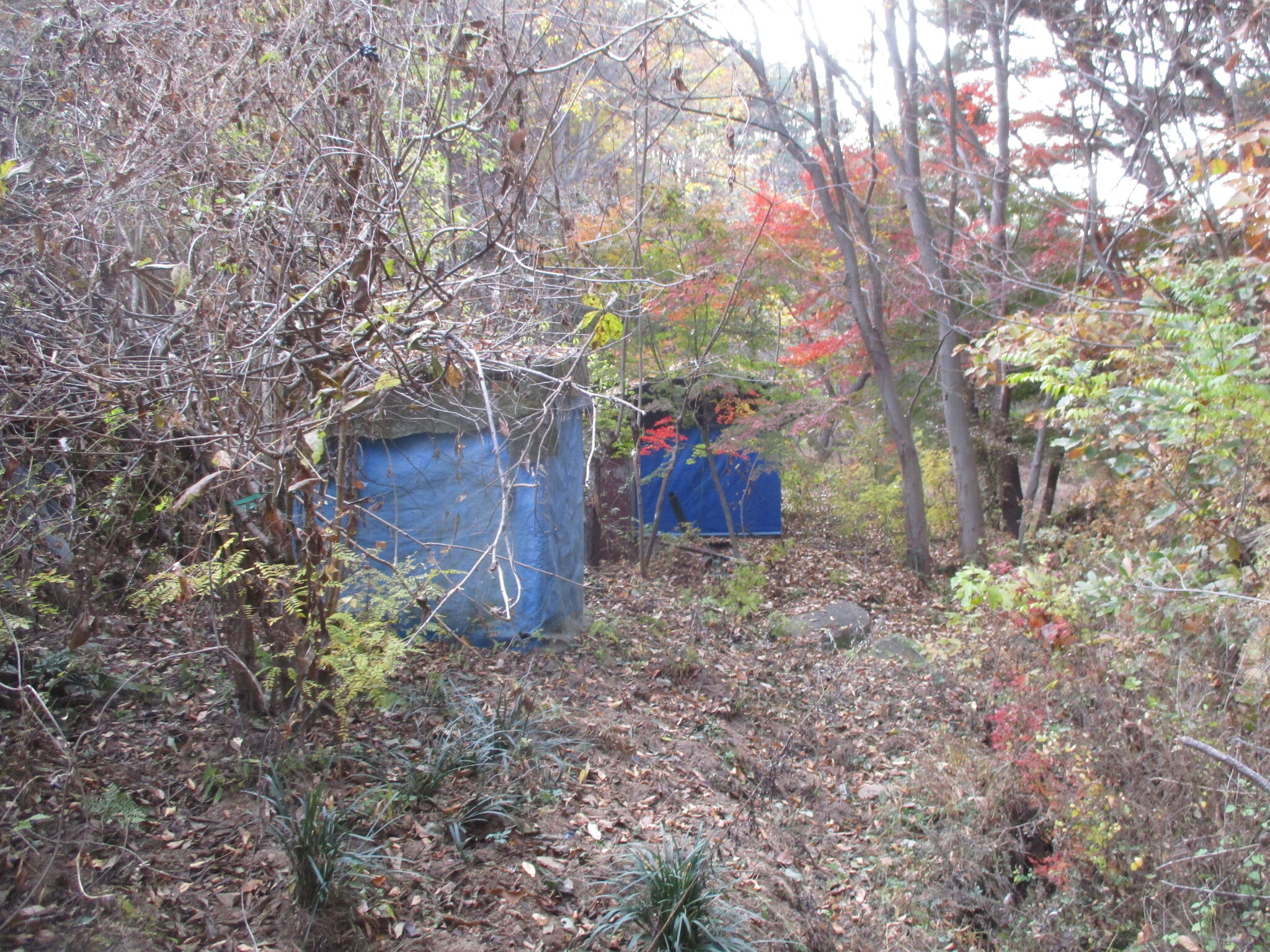 내림~잡풀 무성한 공터 왼쪽 골따라~개활지(묵은 밭이나 과수원 추정)만나 흐릿한 족적따라~파란 움막(왼쪽