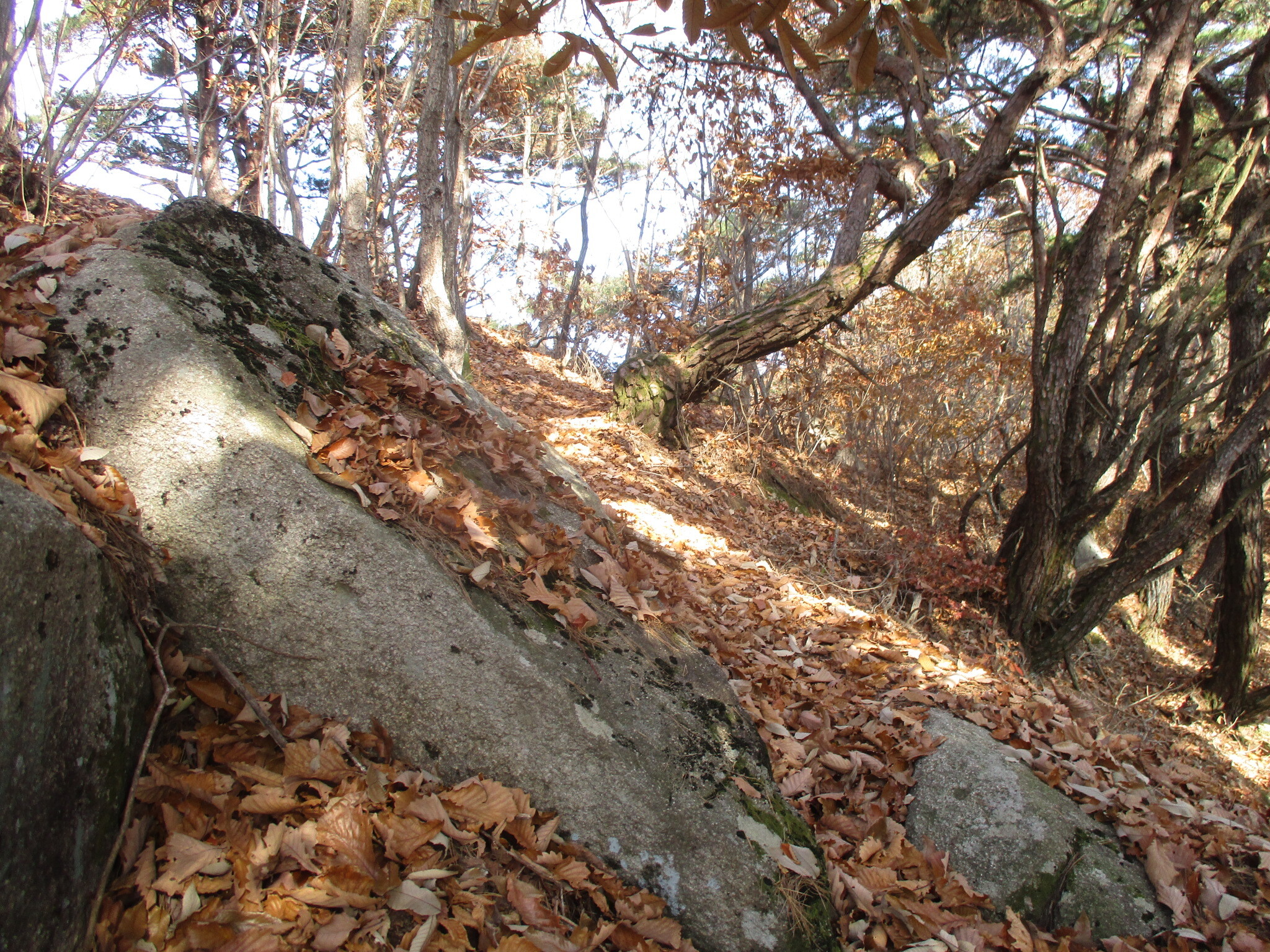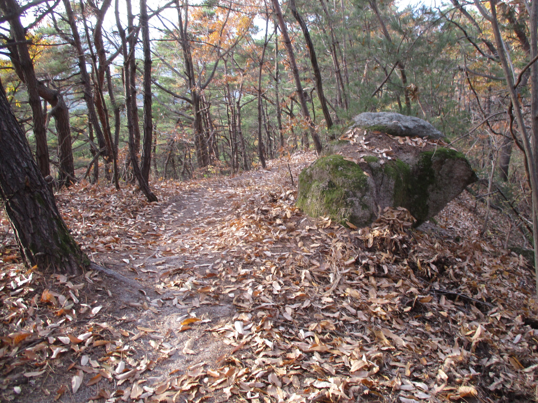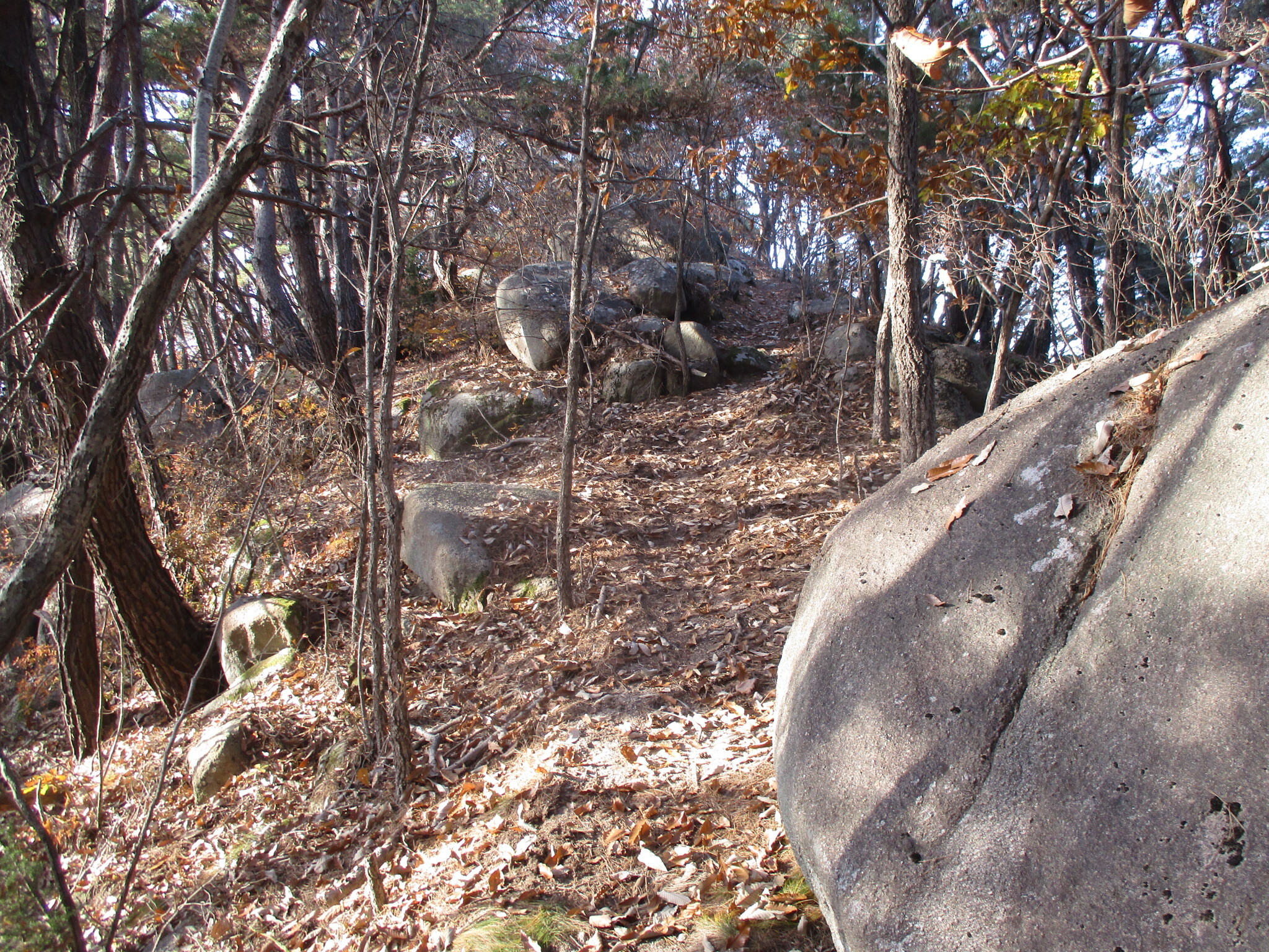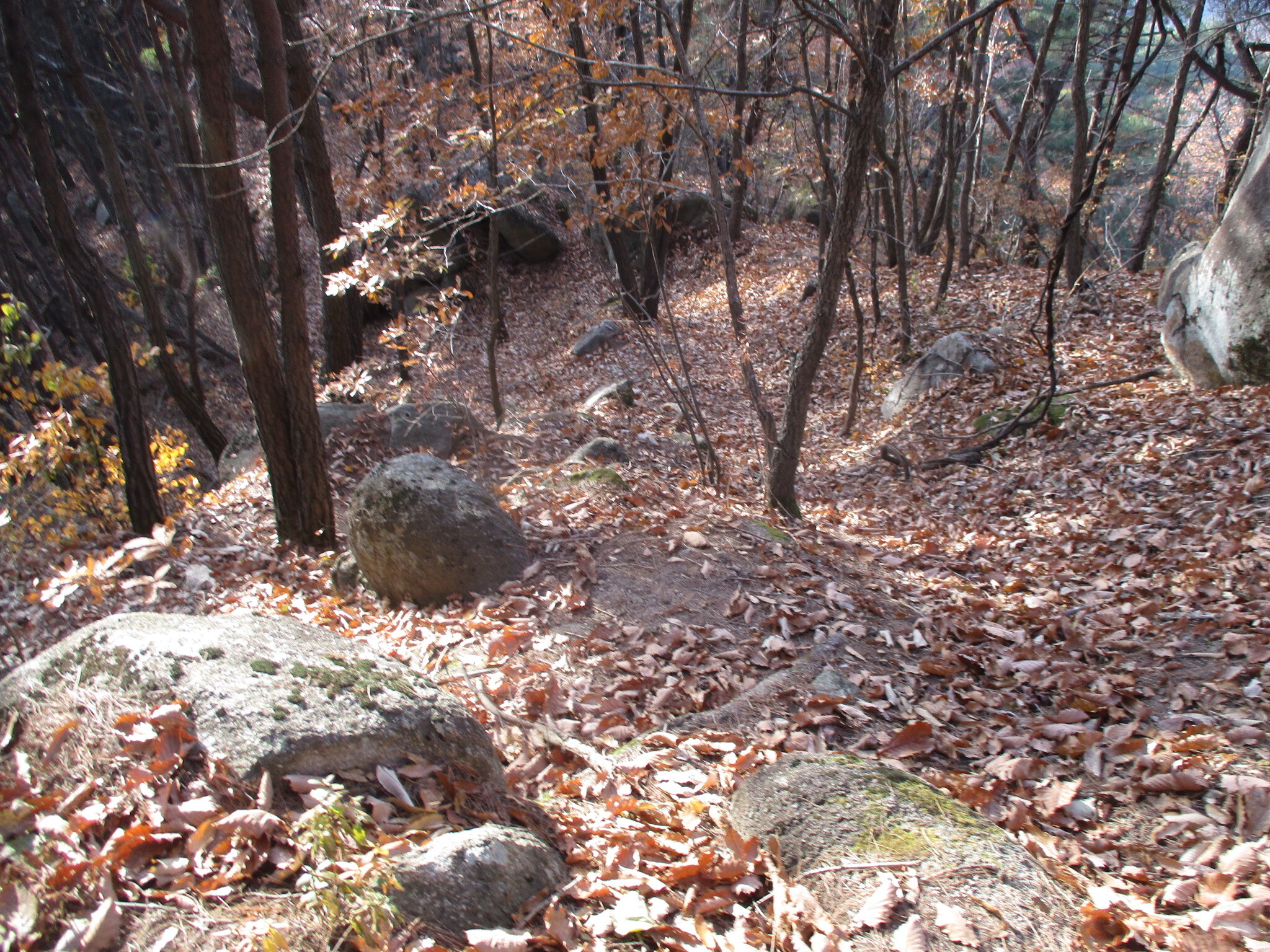 왼쪽으로 휘어져 미끄러분 길을 조슴조슴 내리서면 만나는 봉우리에서도 왼쪽 우회길로 들어서고~, 이끼긴 바우에서는