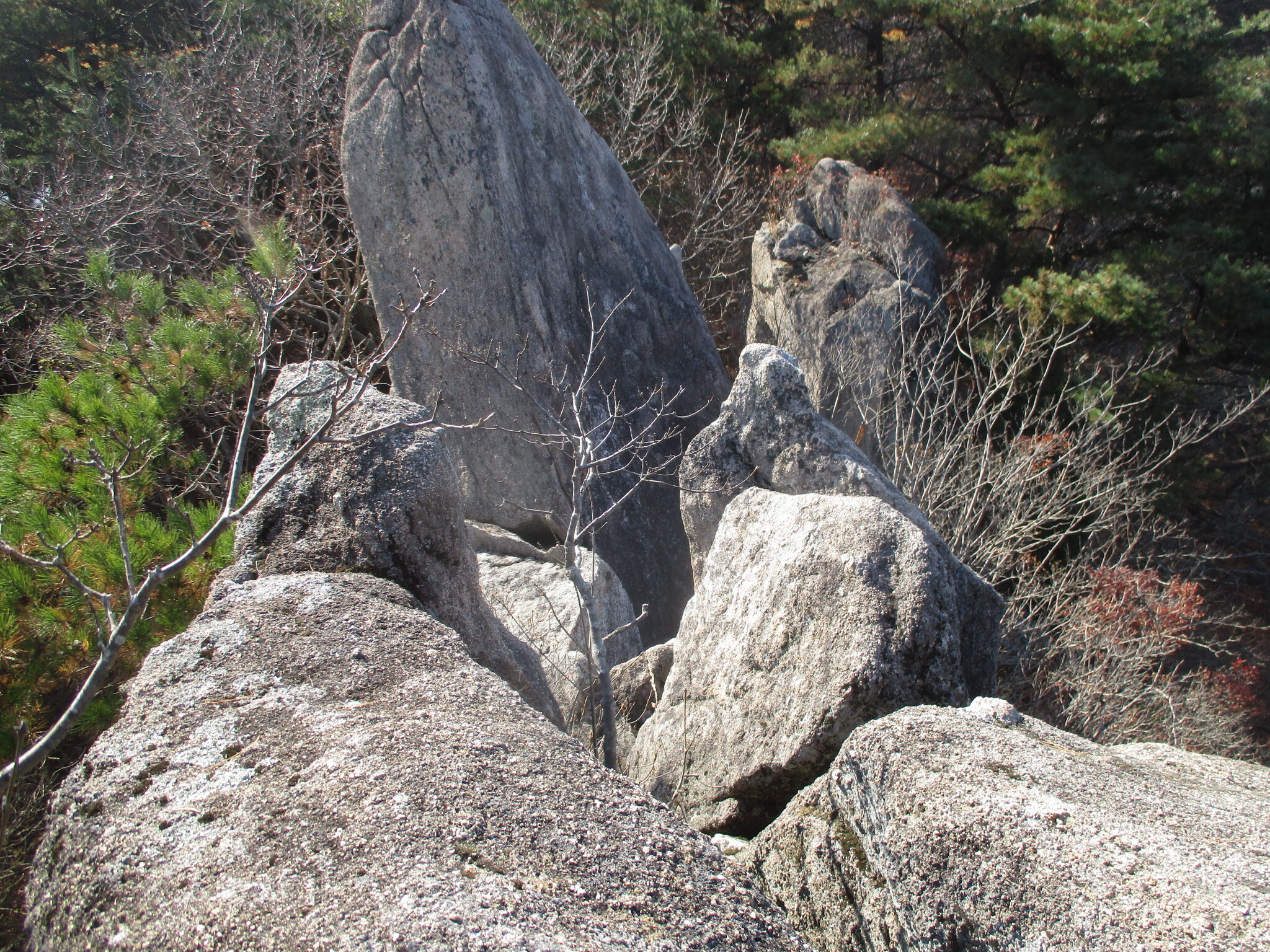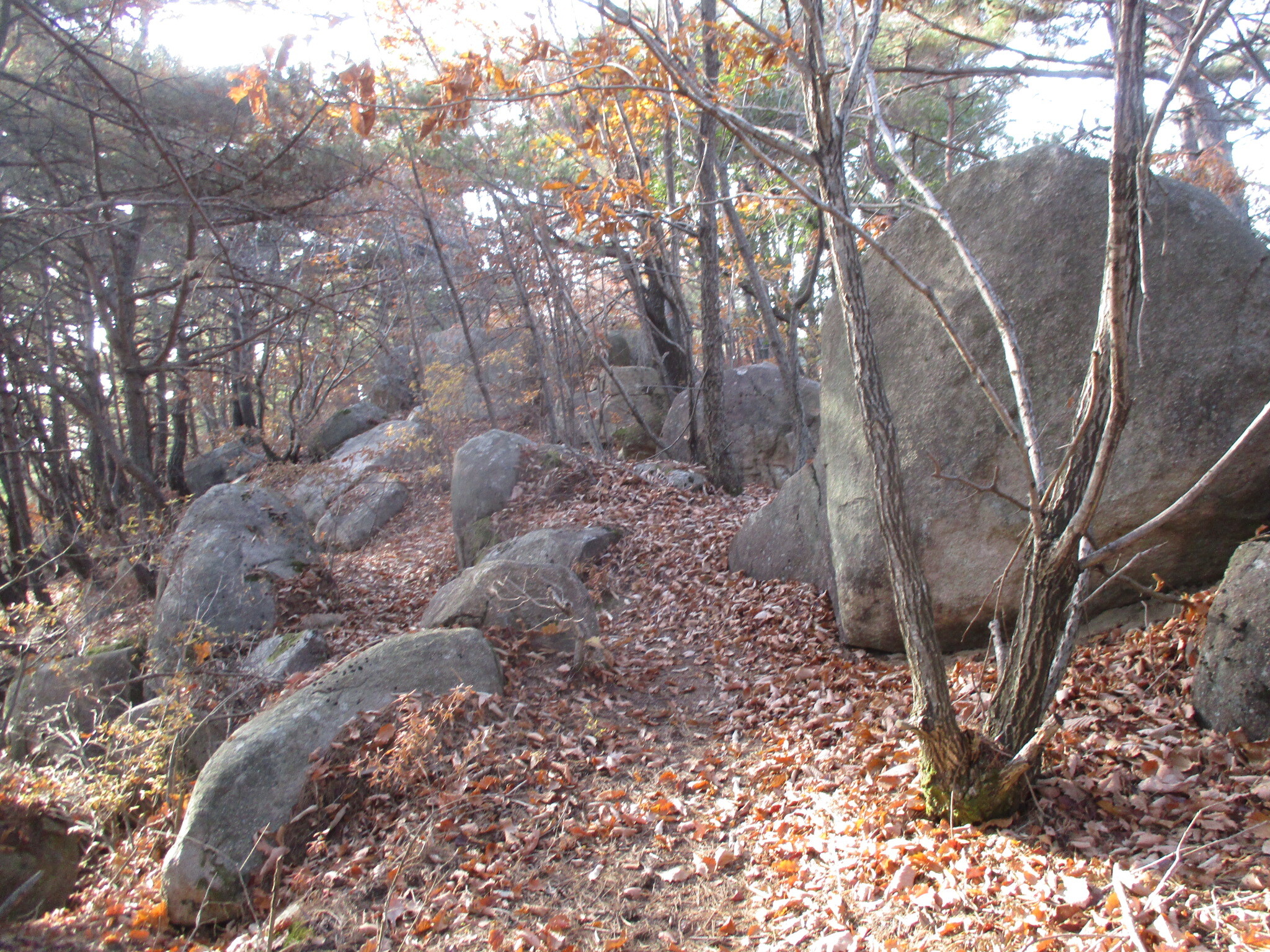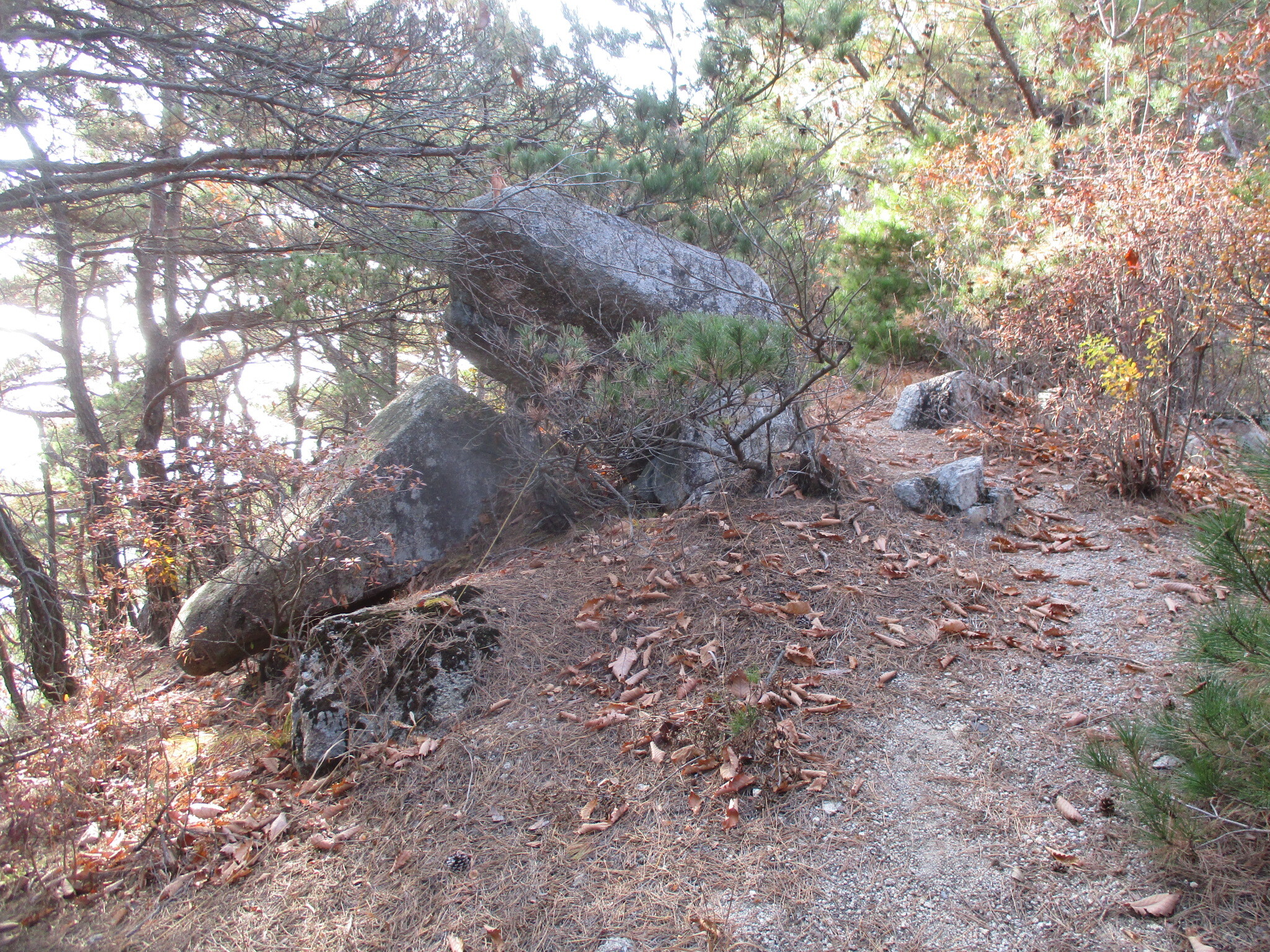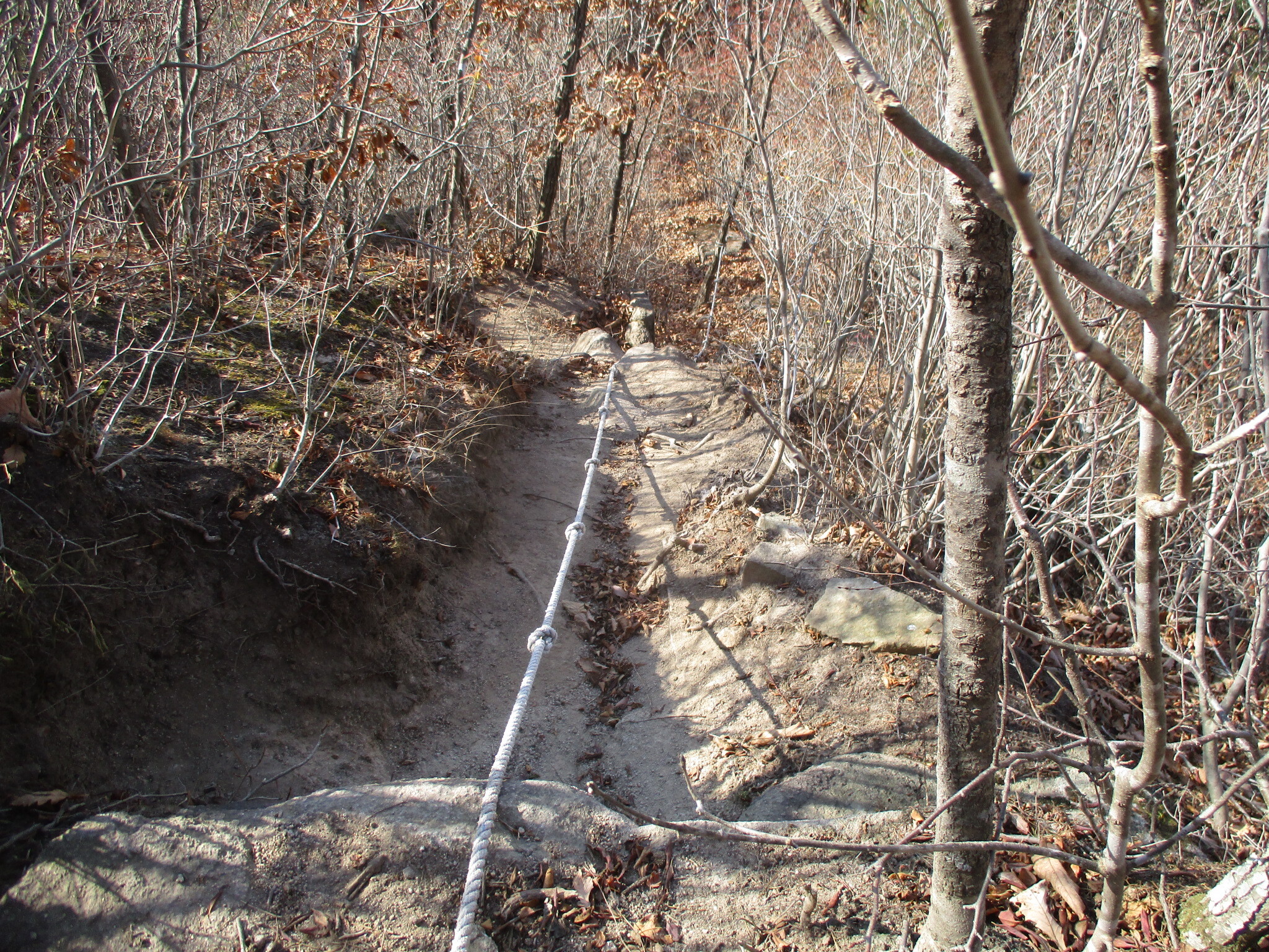 왼쪽으로 휘어져 미끄러분 길을 조슴조슴 내리서면 만나는 봉우리에서도 왼쪽 우회길로 들어서고~, 이끼긴 바우에서는