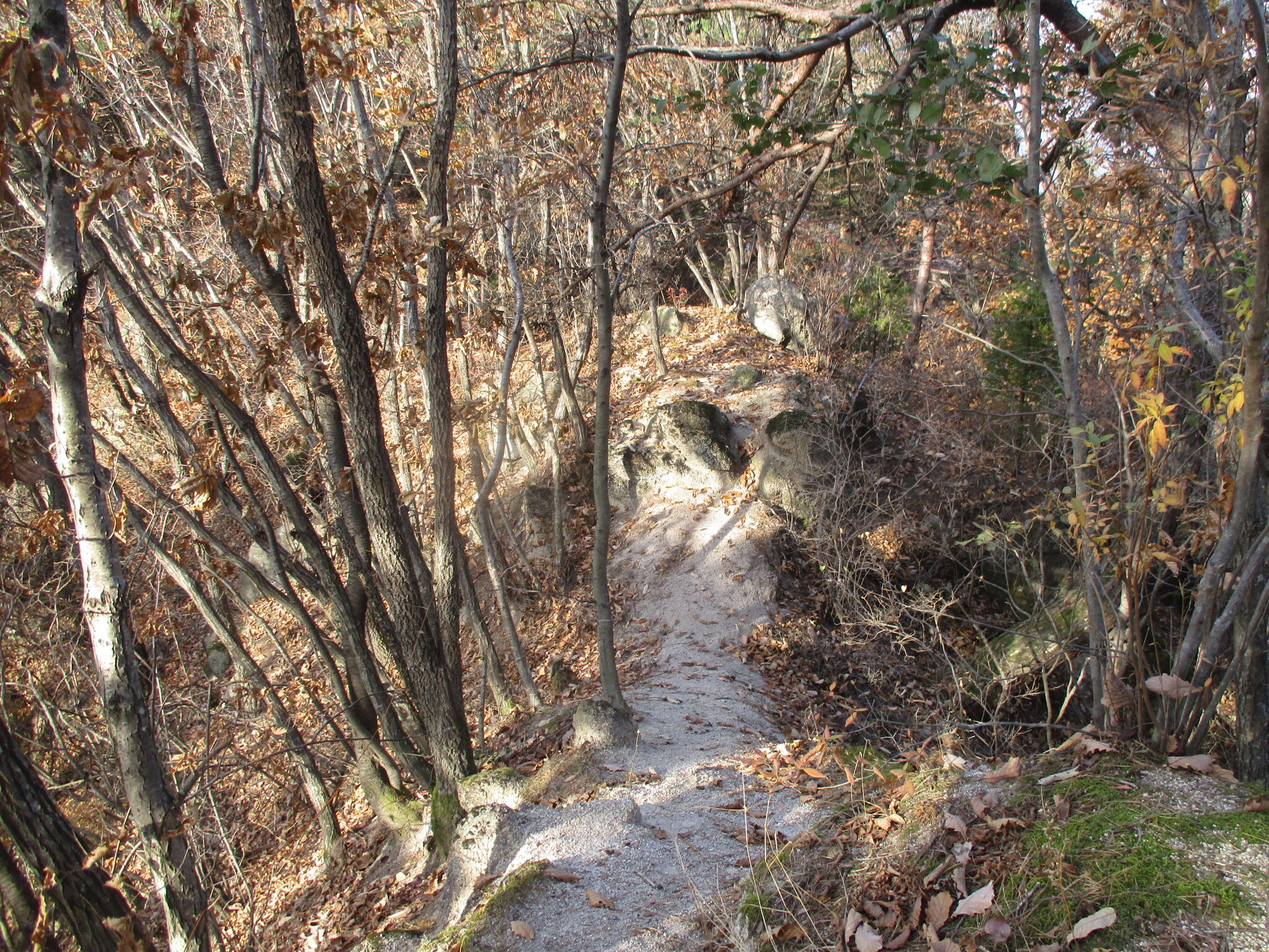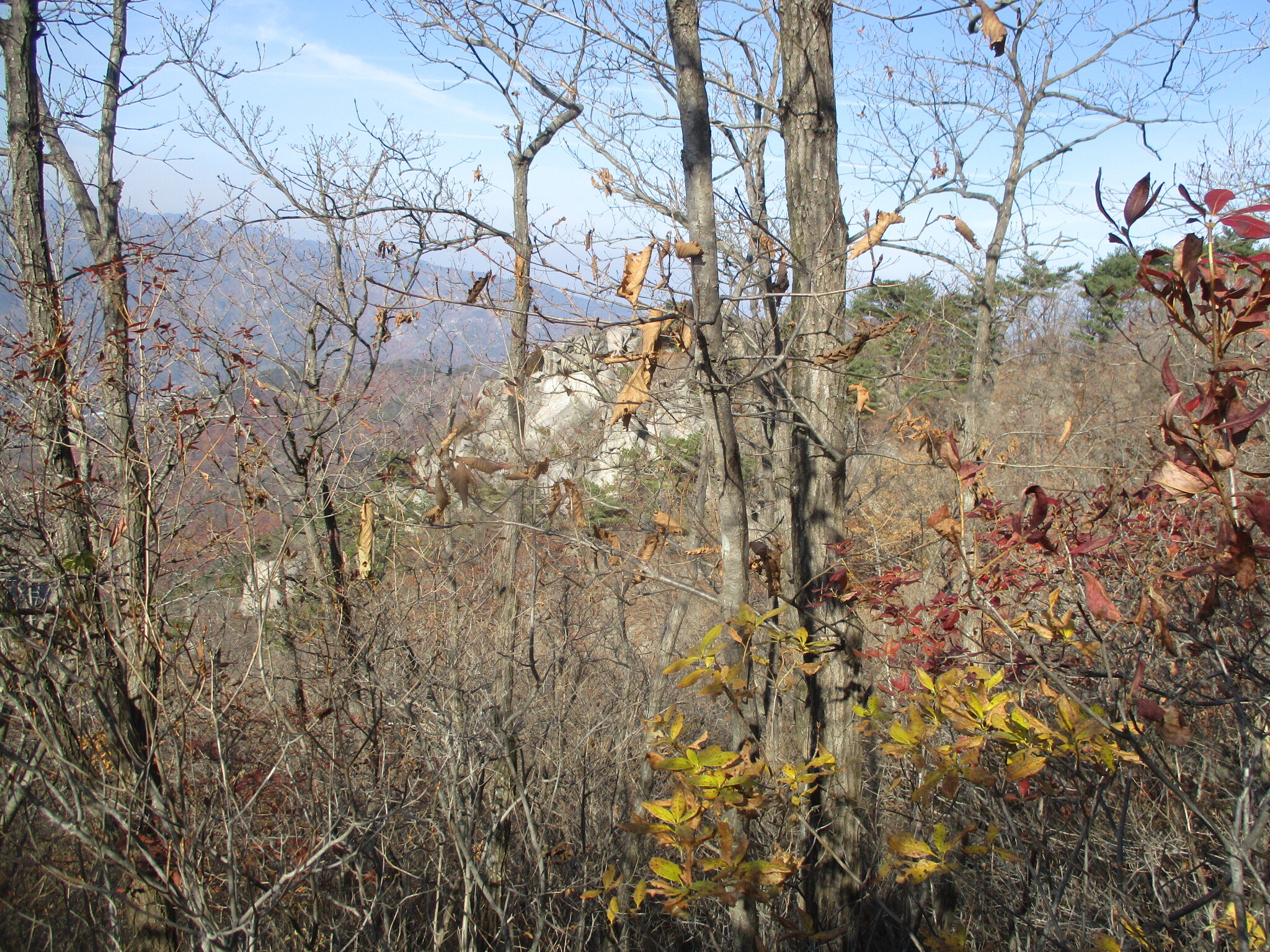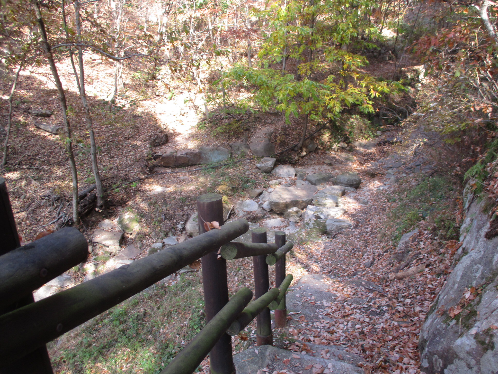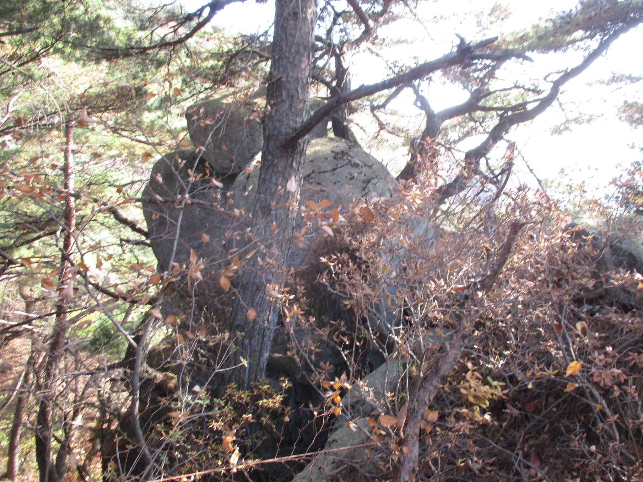 왼쪽으로 휘어져 미끄러분 길을 조슴조슴 내리서면 만나는 봉우리에서도 왼쪽 우회길로 들어서고~, 이끼긴 바우에서는