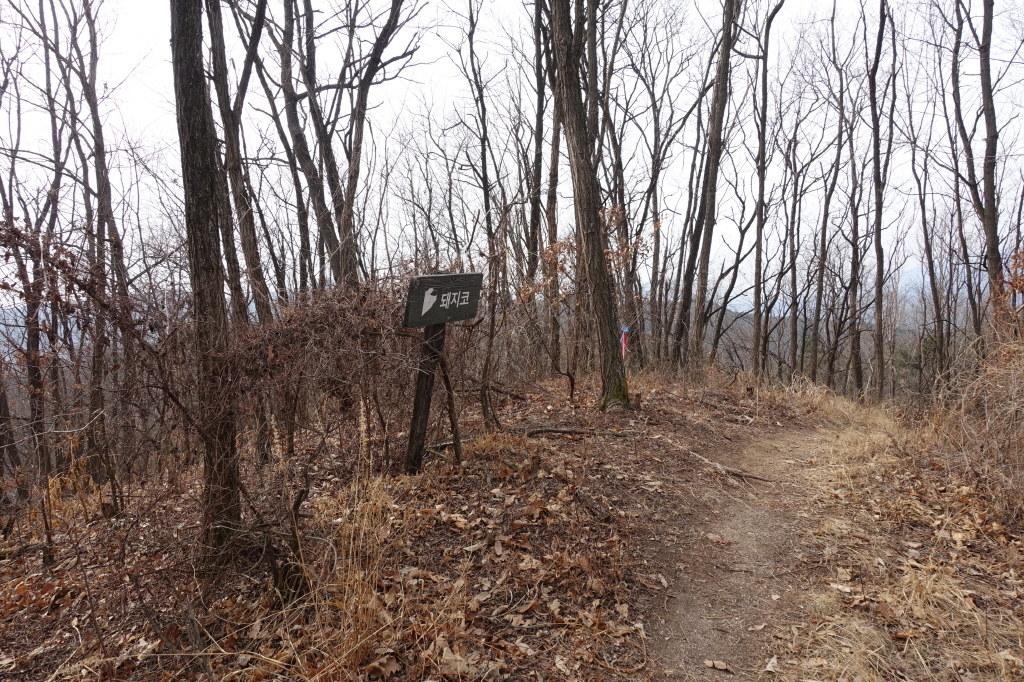 디시 봉우리 왼쪽 사면으로 우회해가 나무가 나자빠져있는 돼지코를 올라가다가 오른쪽 갈림길을 눈에 담아두고~