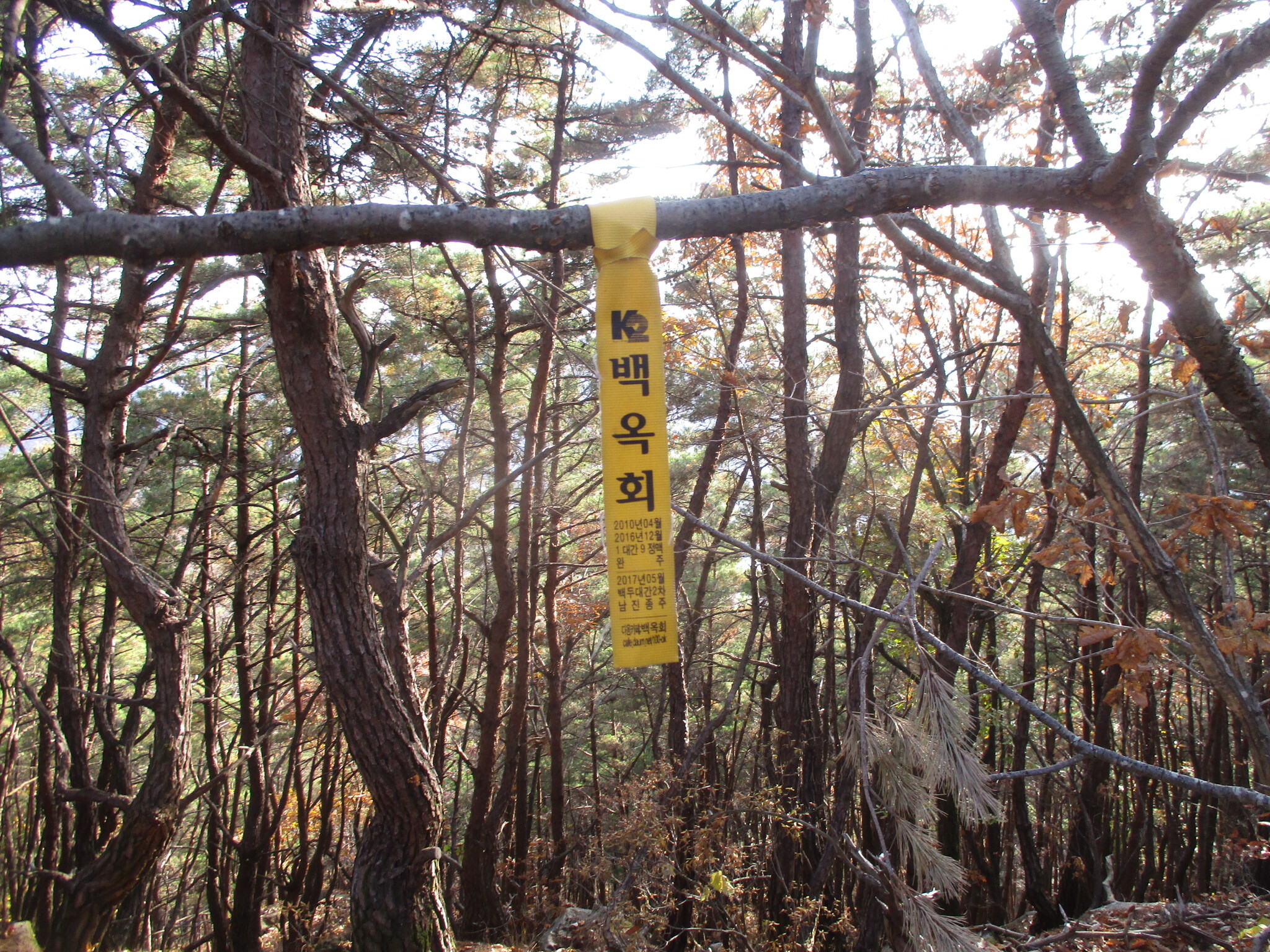 백옥회(13차?) 표지기가 눈을 찌르는 나무가지에 달리 있어가 나무가지를 뿌라뿌고 안쪽에다 걸어 논는다!~