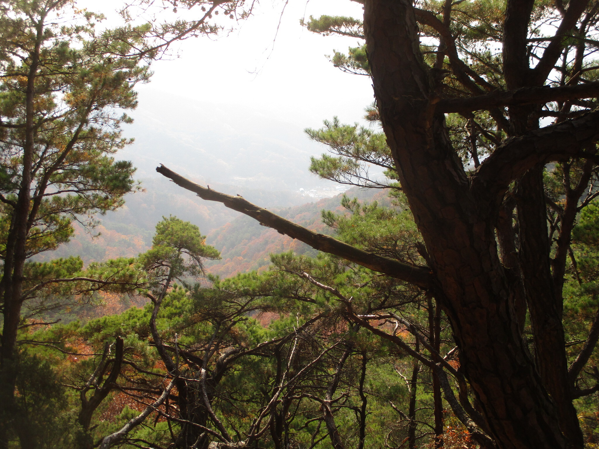 긋해가 나무에 기대가 올라온 골과 초례봉 능선을 쳐다보이 뿌연기 꼬물 카메라 사진이 육안으로 보는것 보다 못하다!~
