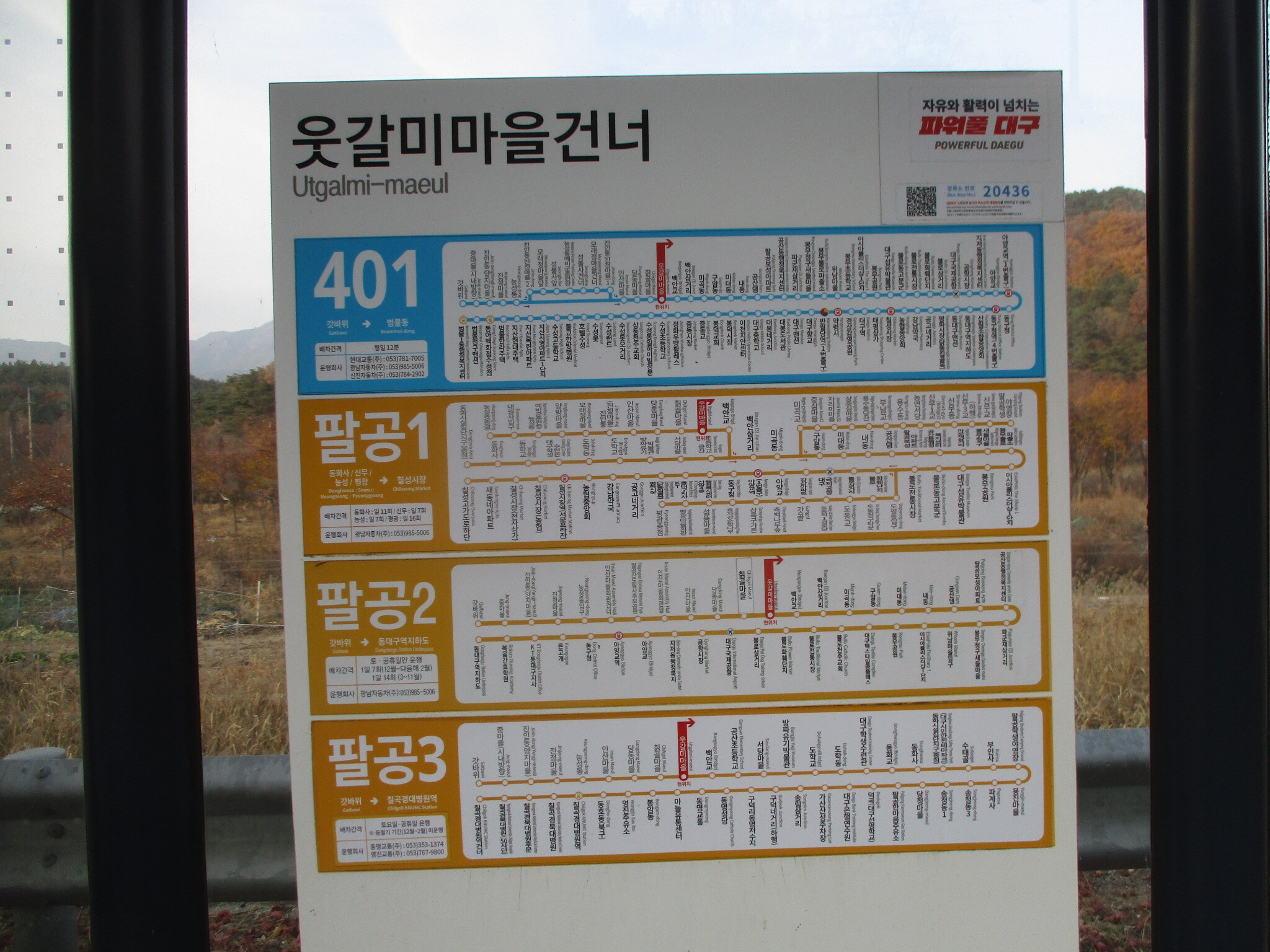 터덜터덜 내리오이 도로 건너 웃갈미마을 버스정류장이 보이고 팔공산 정상부와 주능선이 뚜렷하이 보인다!~