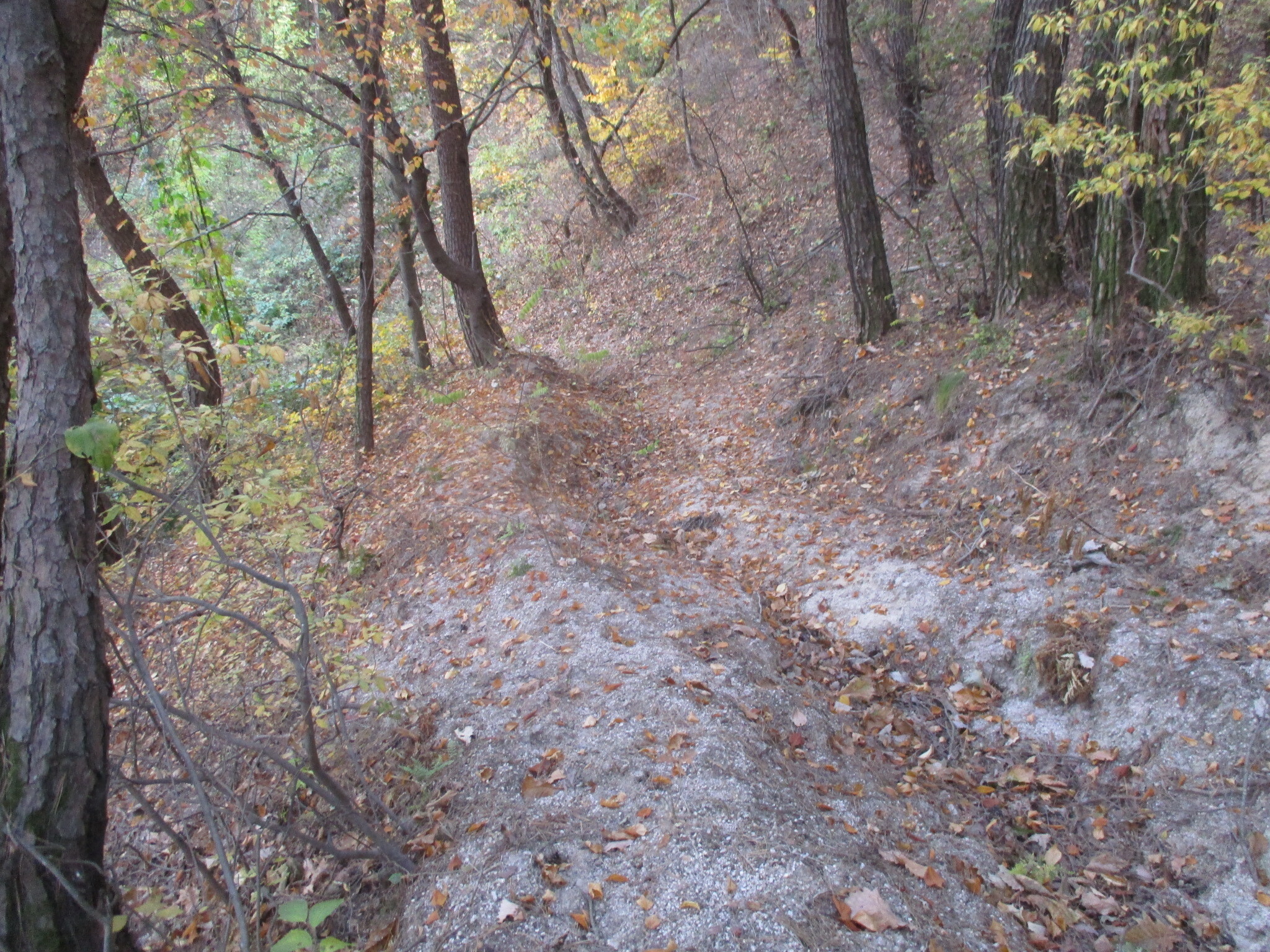 왼쪽으로 휘어지는 미끄럽고 가파른 내림~왼쪽 사면으로(오트바이 자죽있음)~평탄한길~다시 왼쪽 사면으로~