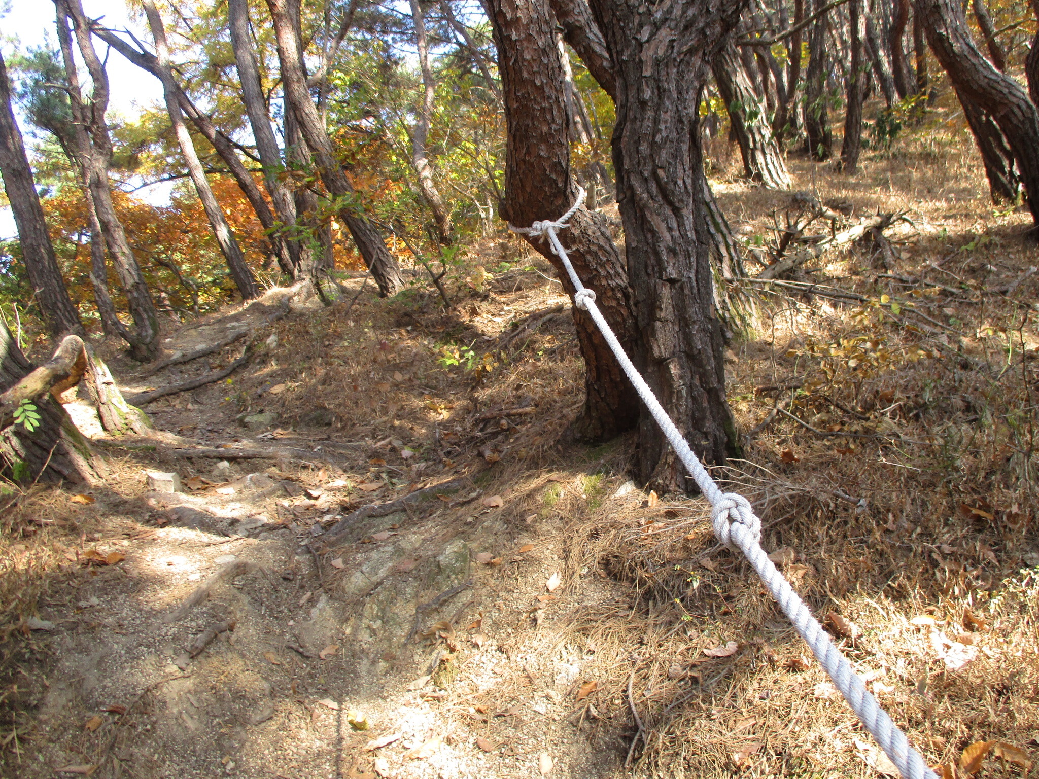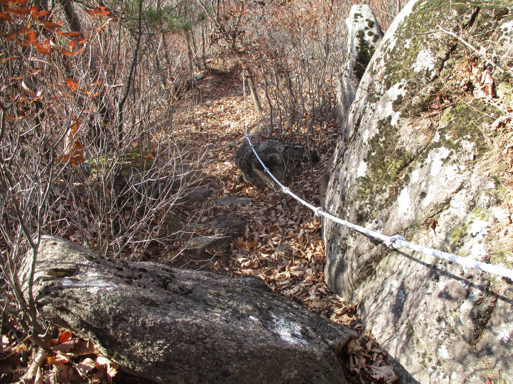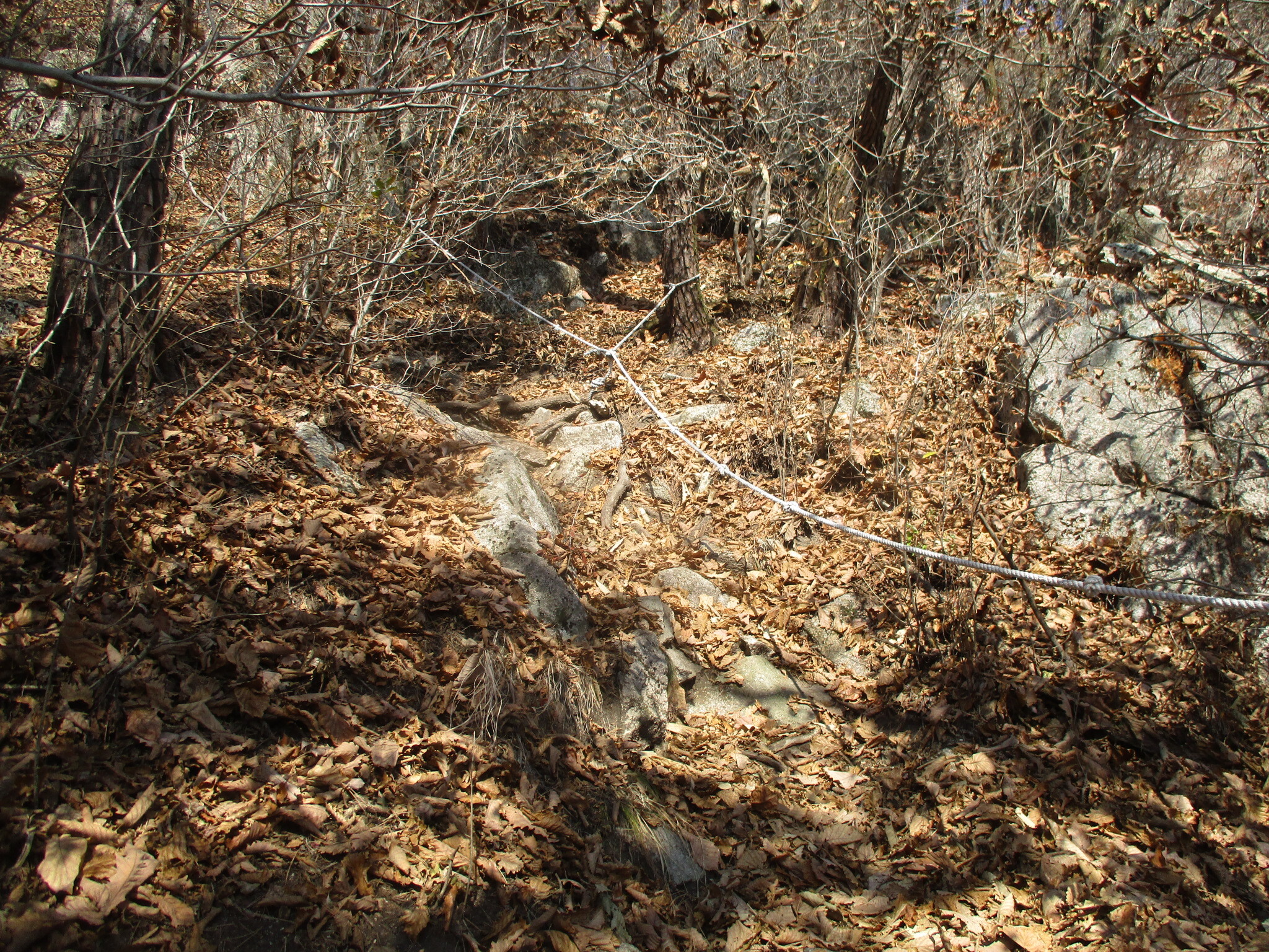 가파르고 미끄러운 내림(주의)~연이은 밧줄지대~오른쪽 사면~암봉 오름길~촛대바위~염라굴(?) 암릉(위험)~